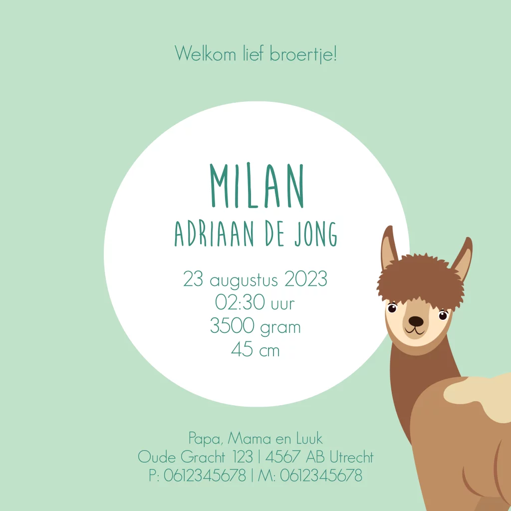 Hip geboortekaartje voor een jongen met alpaca. (3599)