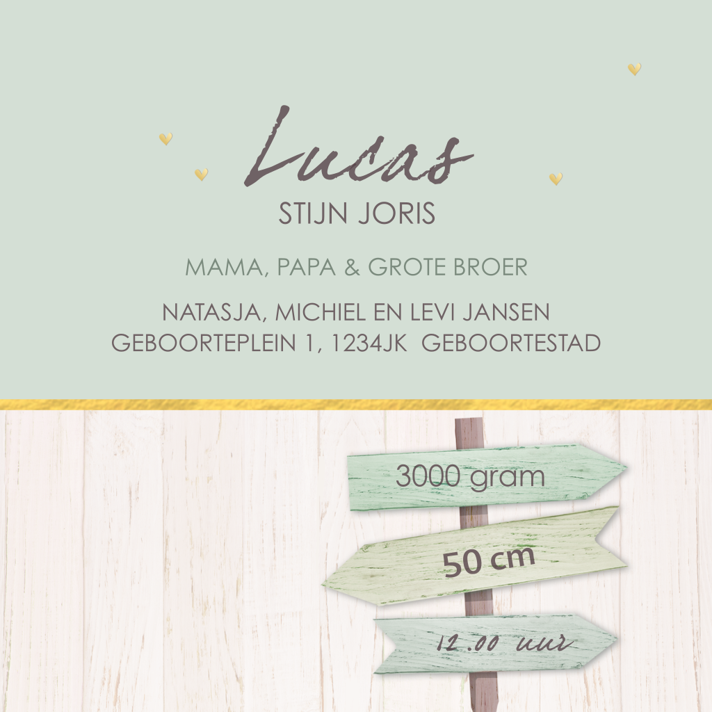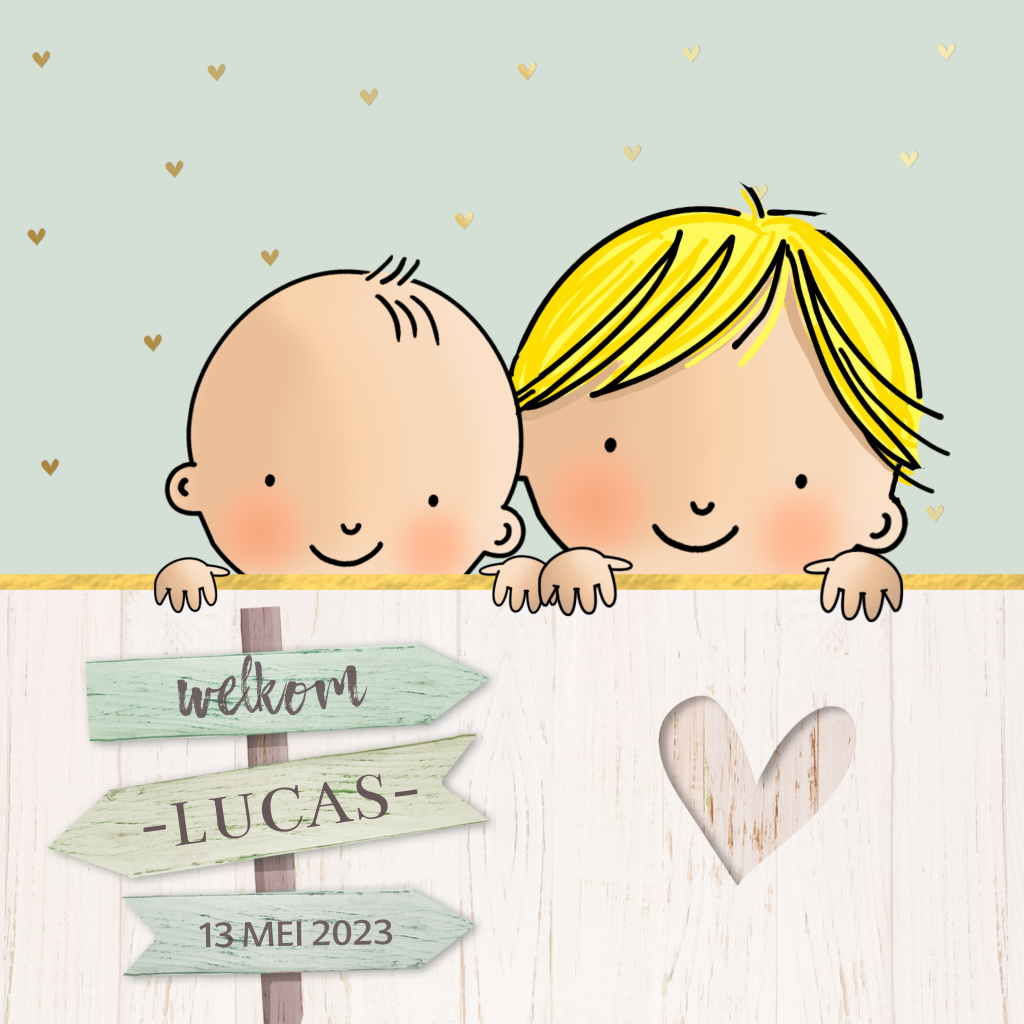 Geboortekaartje tweede kindje baby jongen met broertje sloophout groen. Ben je opzoek naar een andere gezinssamenstelling neem dan even contact op met onze klantenservice. We helpen je graag! (4106)