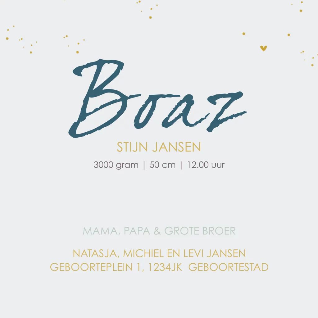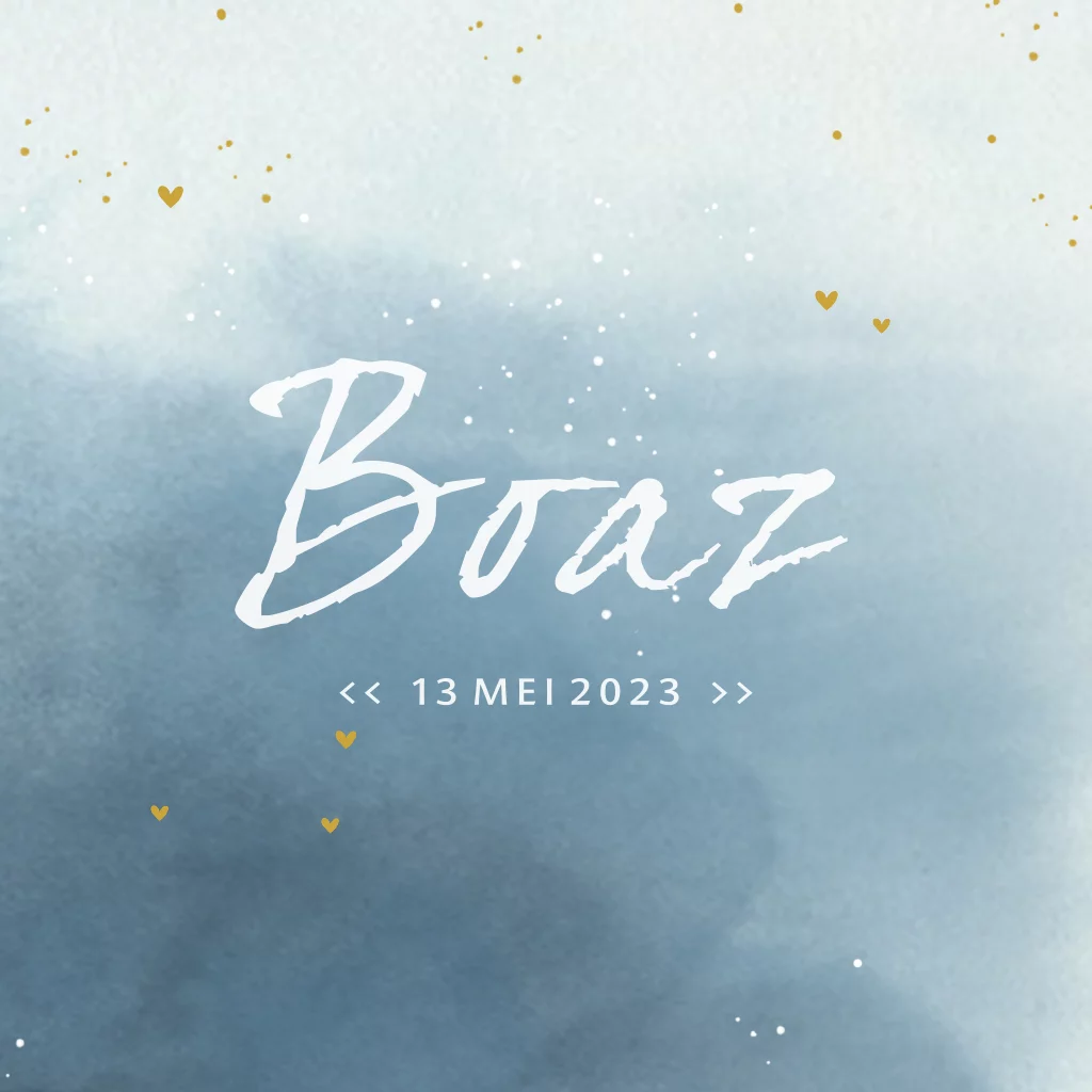 Geboortekaartje Boaz baby jongen overloop blauw met goudkleurige hartjes en stipjes. (4083)