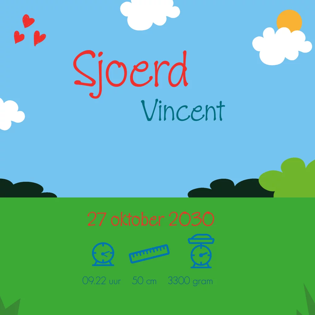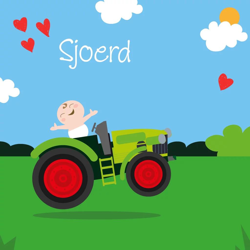 Grappig geboortekaartje met een getekende baby die op de trekker zit. Op de achtergrond een weiland. (3323)