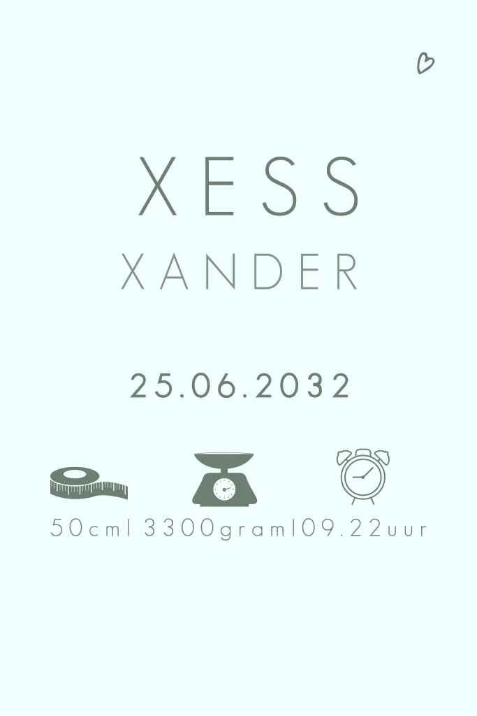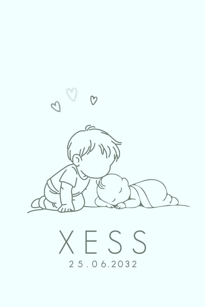 Een warm en ontroerend geboortekaartje voor een jongen met een subtiele lijntekening van een grote broer die zijn kleine broertje een kus geeft terwijl hij slaapt. Dit ontwerp straalt verbondenheid en liefde uit tussen de broertjes. Pas het ontwerp eenvoudig aan naar eigen wens in onze online editor.