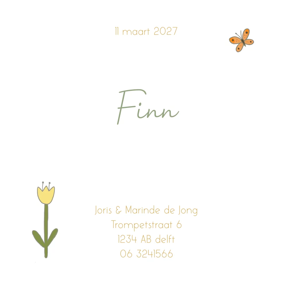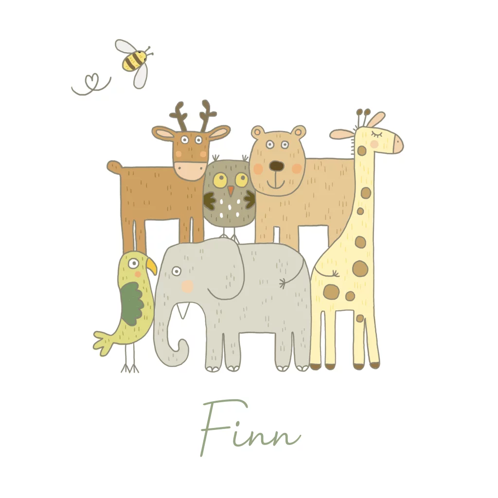Een hip geboortekaartje met een vrolijke dierenboel. Bij, hert, uil, beer, olifant papegaai en giraf. (4351)