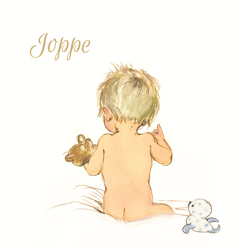 Lief getekend geboortekaartje voor een jongen. Een kindje met een knuffel beer. (3885)