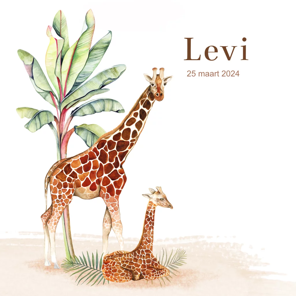 Geboortekaartje met lief girafje en moedergiraf in junglestijl gemaakt in aquarel. (4360)