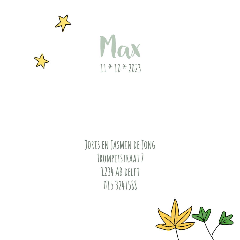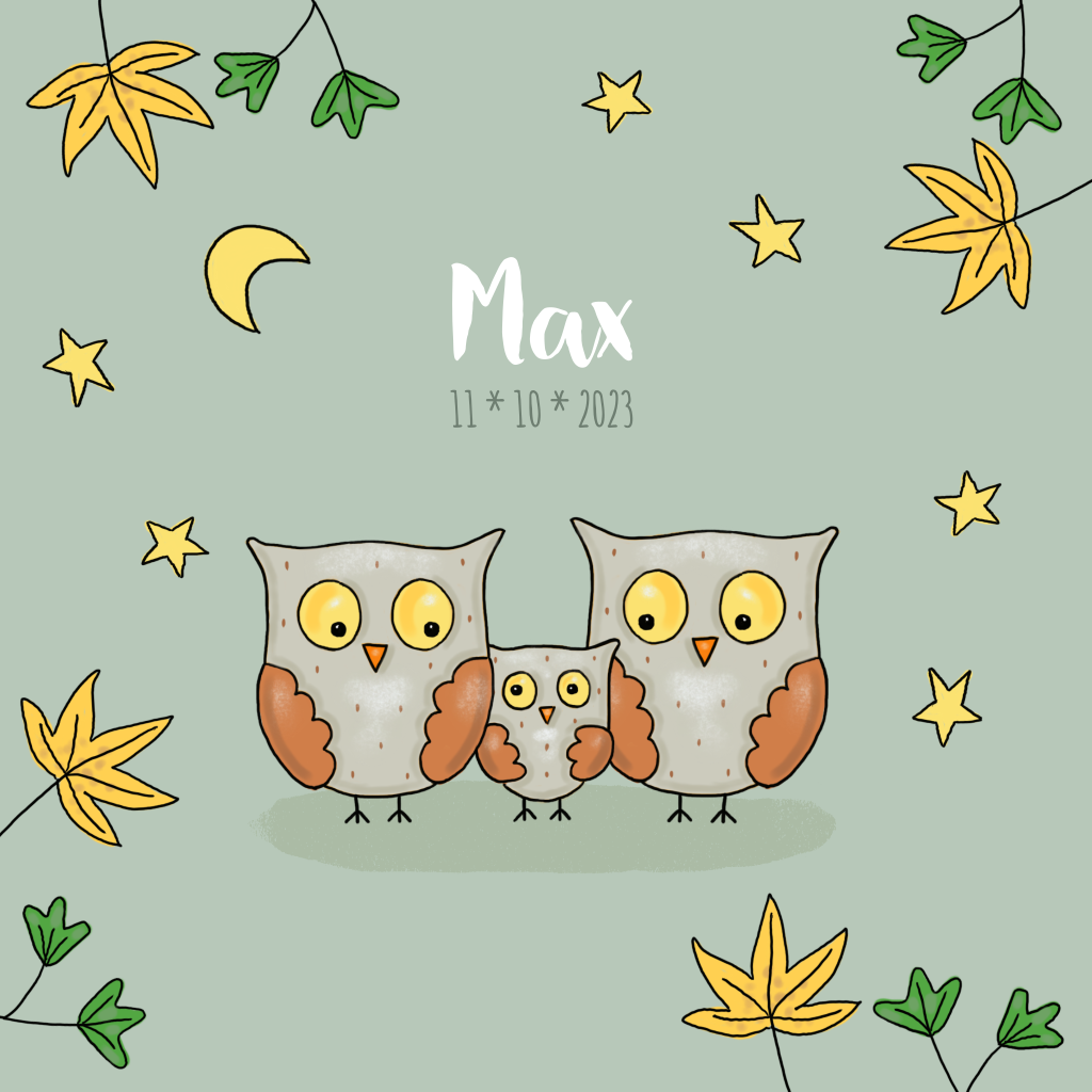 Een hip en vrolijk herfst geboortekaartje met 3 uilen en herfstbladeren voor een jongen. (3248)