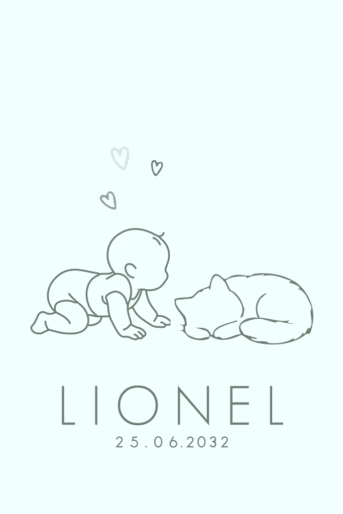 Een schattig en minimalistisch geboortekaartje voor een jongetje met een lieve lijntekening van een kruipende baby en zijn kat naast zich. Het ontwerp heeft een frisse, tijdloze uitstraling. Pas het ontwerp eenvoudig aan naar eigen wens in onze online editor. Uit de speciale huisdieren collectie 'Thuis is met jou 🐾.