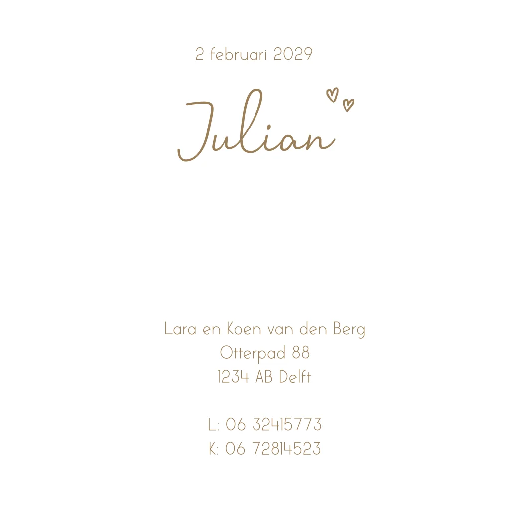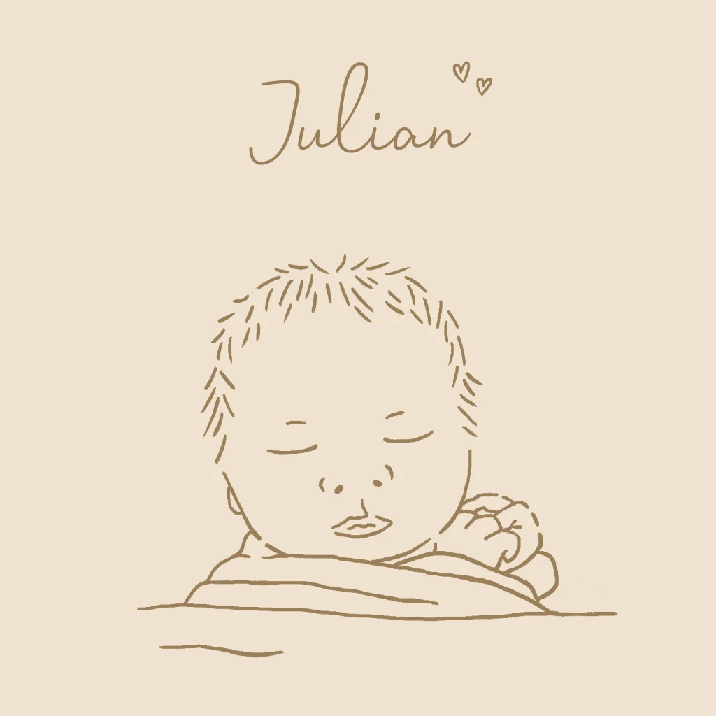 Een modern geboortekaartje met een lijntekening van een baby in warme kleuren