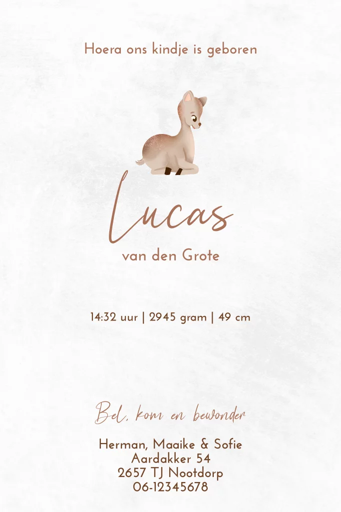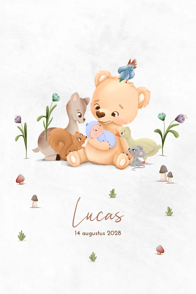 Geboortekaartje jongen met beertje, hert en eekhoorn. (4525)