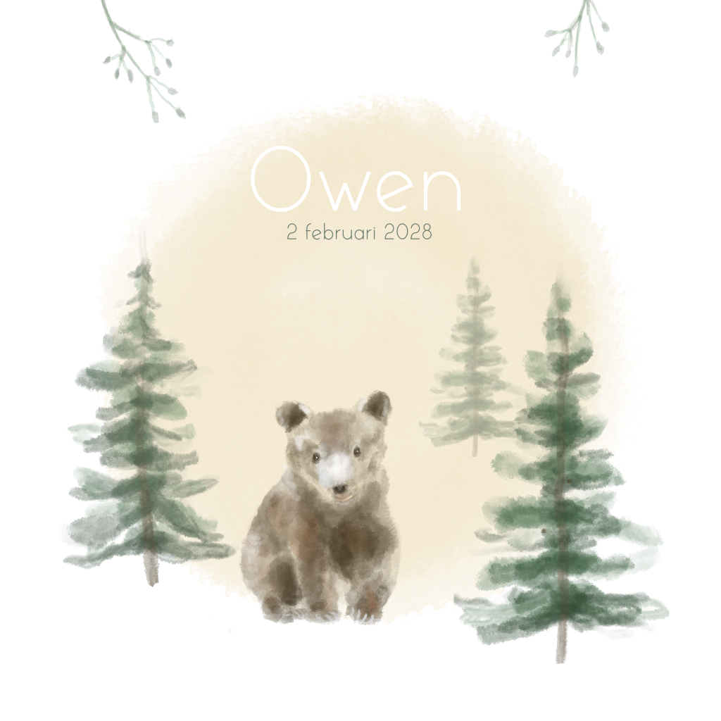 Een lief geboortekaartje voor een jongen met beer en naaldbomen geschilderd in aquarel. (4635)