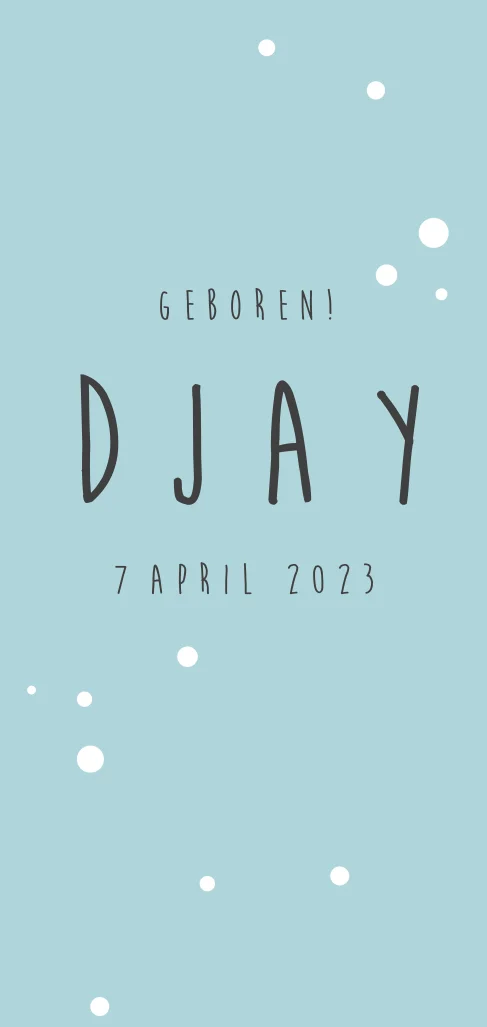 Stoer geboortekaartje voor een jongen met witte stippen op een blauwe achtergrond en een foto.