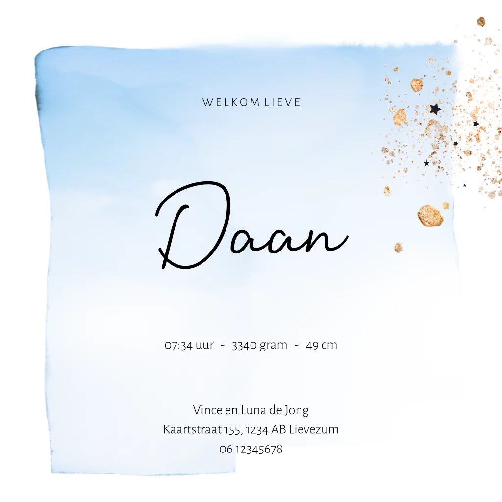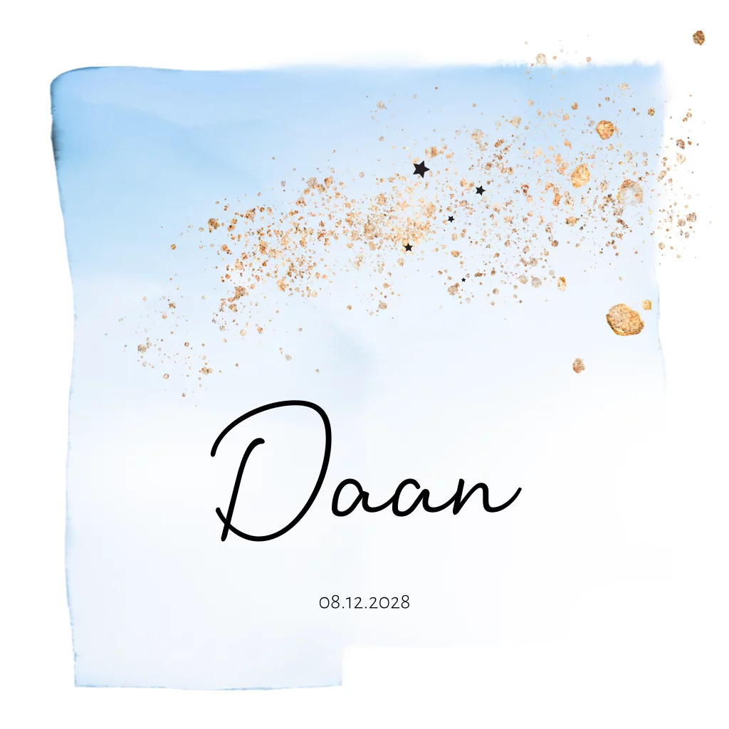 Geboortekaartje Daan jongen modern met blauw en goudlook spetters. Lekker fris en mooi. (4506)
