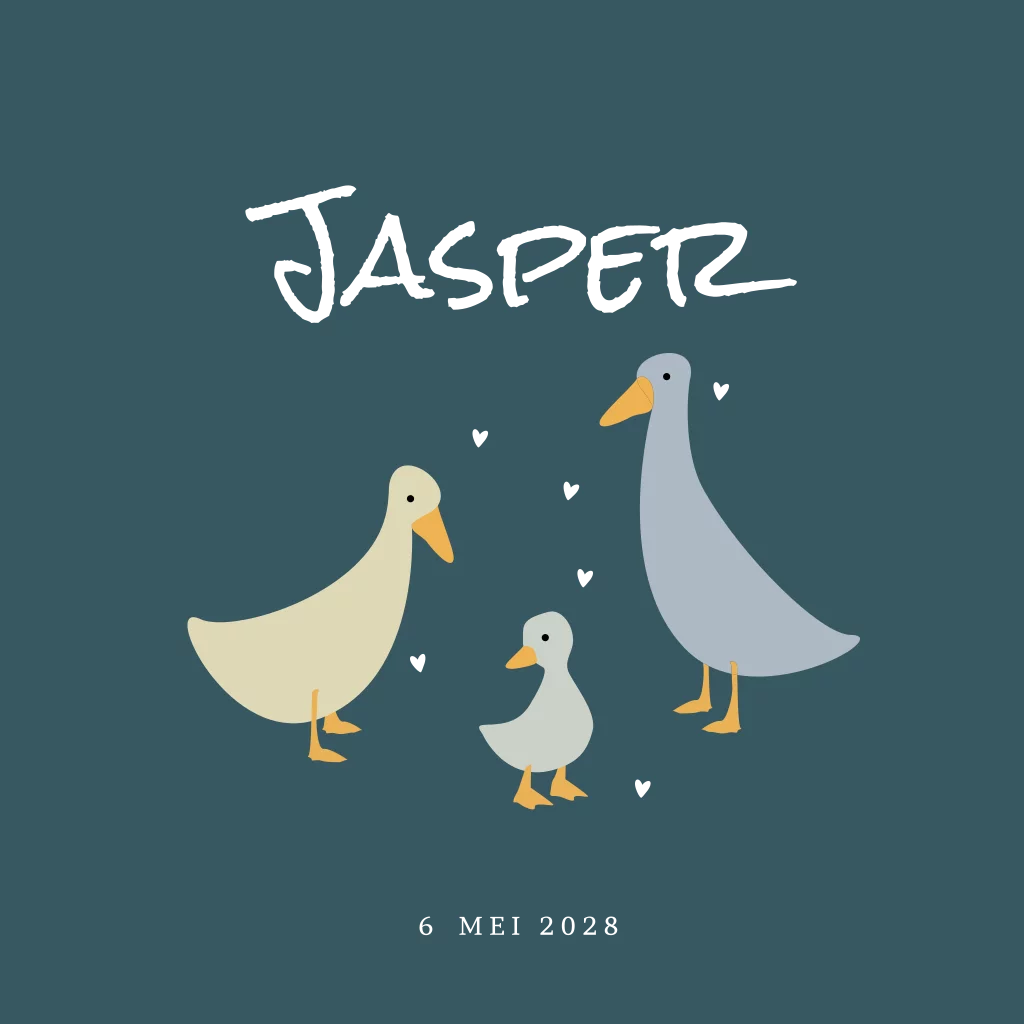 Geboortekaartje petrol met familie gansjes en foliedruk. (4255)