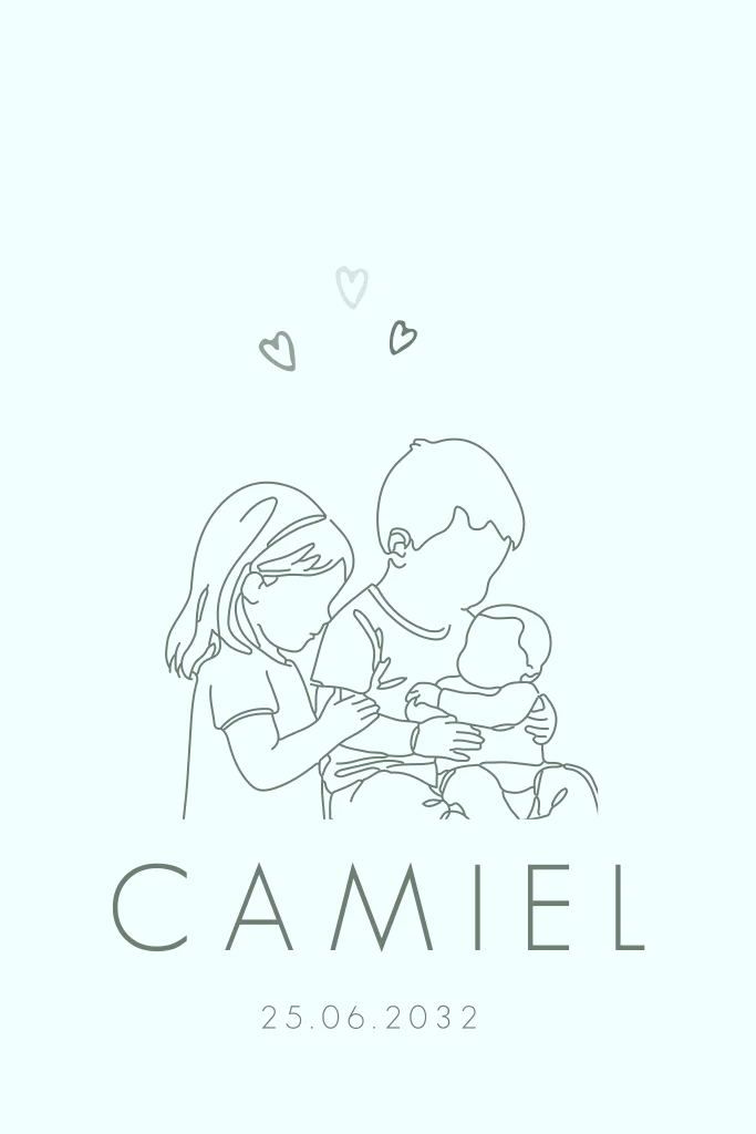 Een lief geboortekaartje met mint illustratie van kinderen. Personaliseer naar wens in onze online editor.
