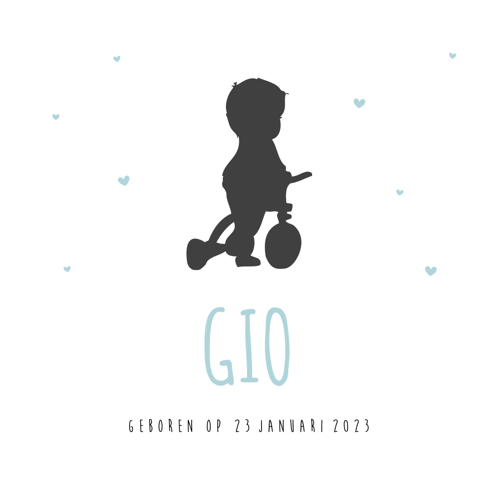Eenvoudig, hip geboortekaartje voor een jongen met blauwe hartjes en een silhouet van een jongetje op een loopauto loopfiets. Pas de kleuren en typografie makkelijk aan in de editor.