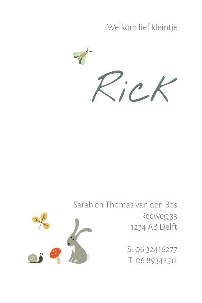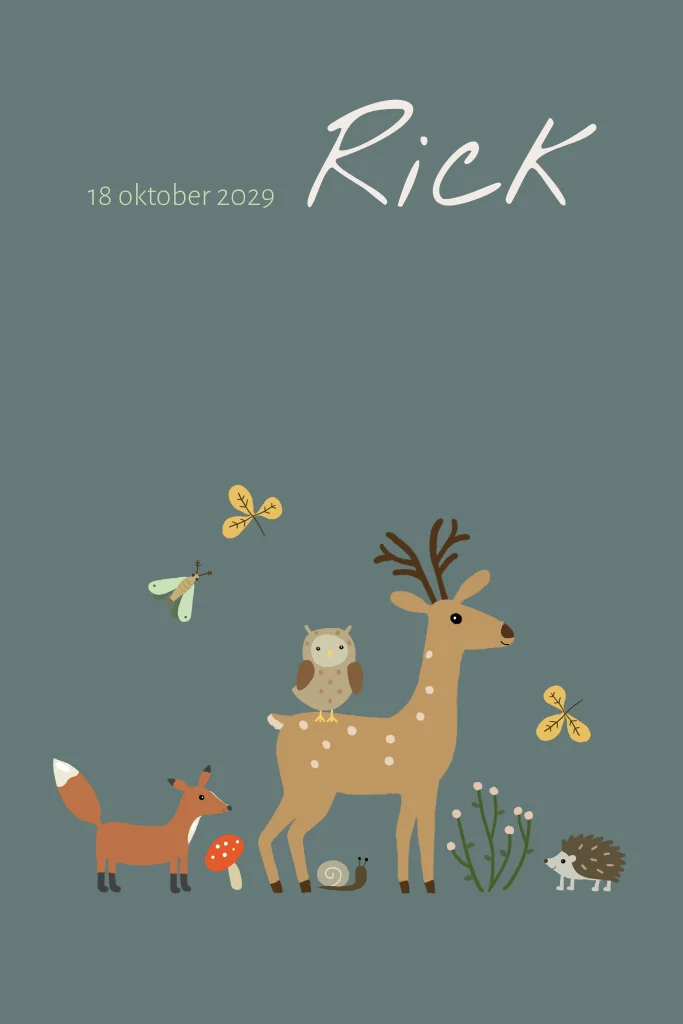 Een modern en sfeervol jongens geboortekaartje voor een herfstbaby met bosdieren, hert, vos, eekhoorn, nachtvlinder, egel, slak, konijn en bladeren