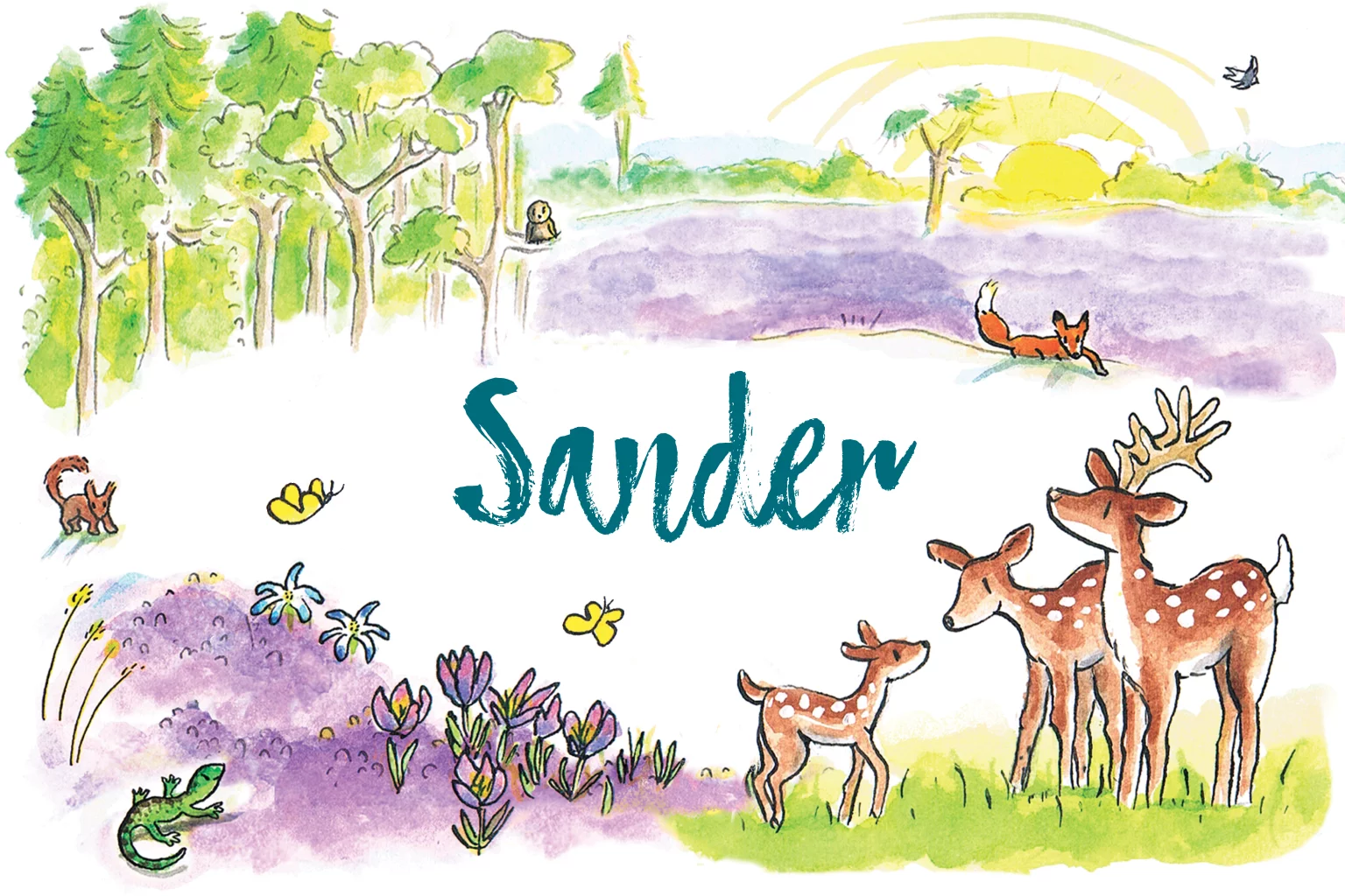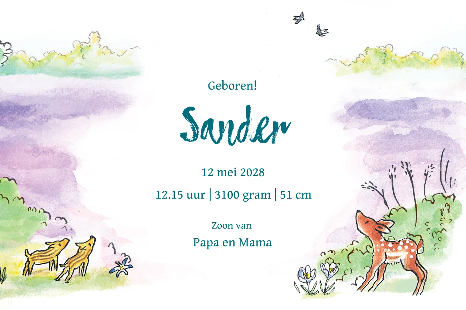 Lief geboortekaartje voor een jongen met dieren en de zon. (3658)