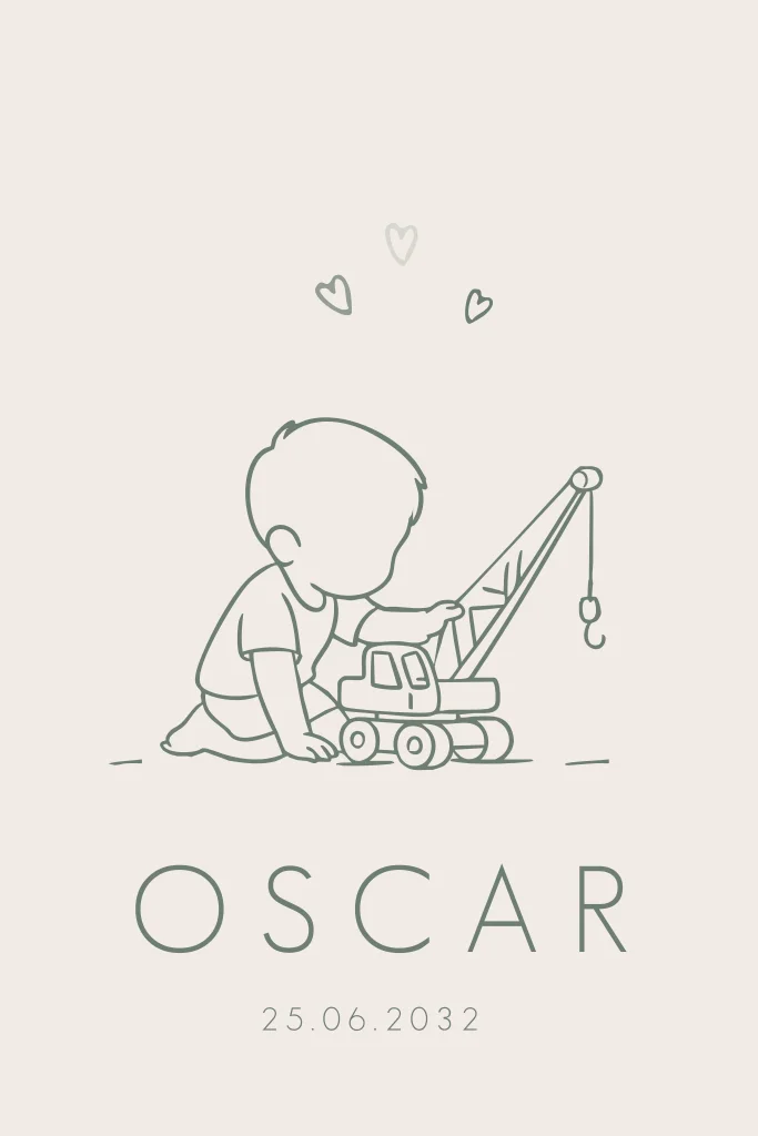 Geboortekaartje jongen speelt met hijskraan lijntekening