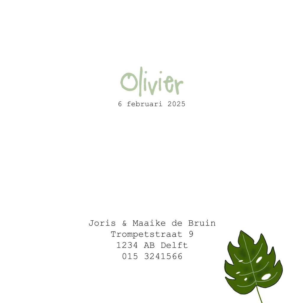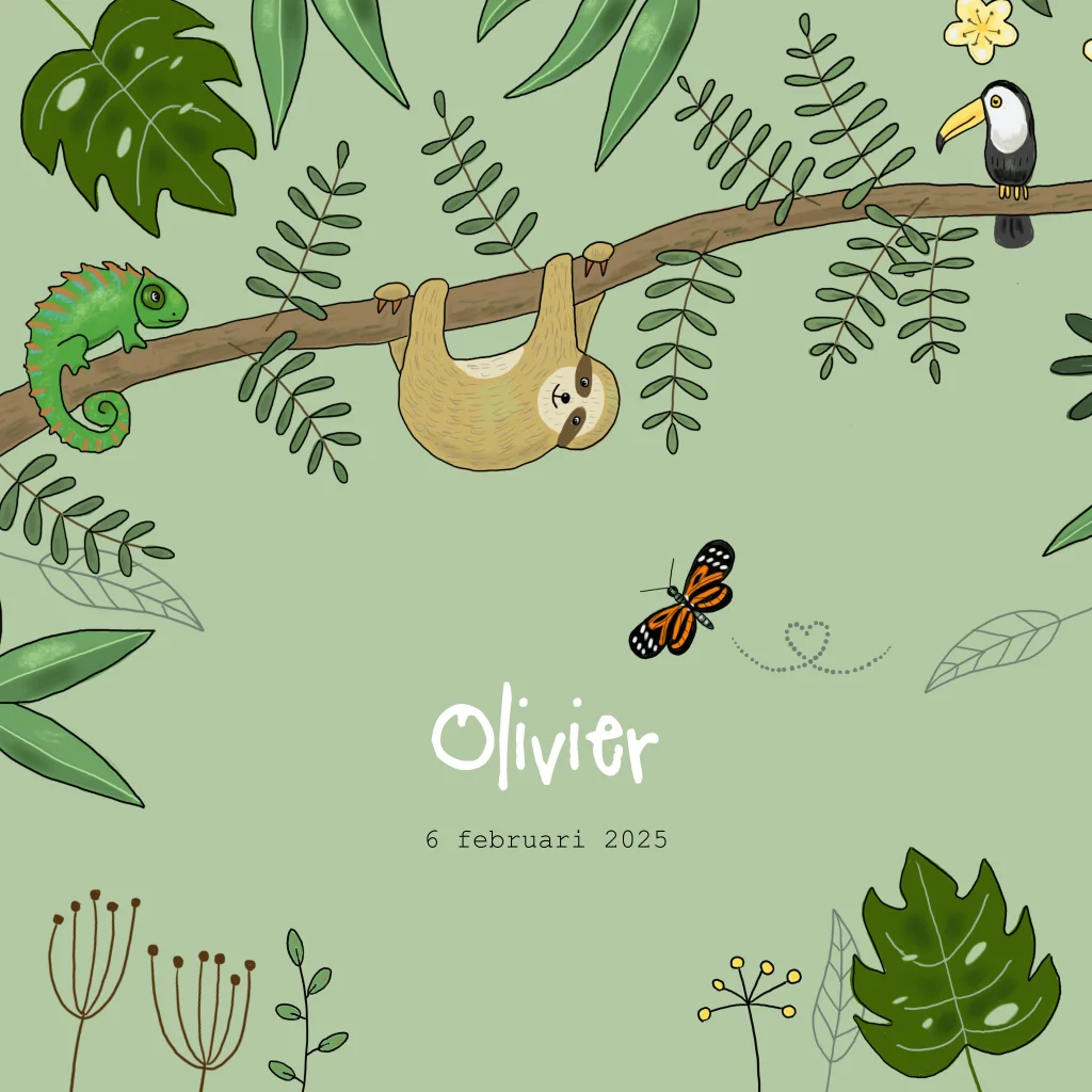 Geboortekaartje jongen jungle, kameleon, luiaard en toekan