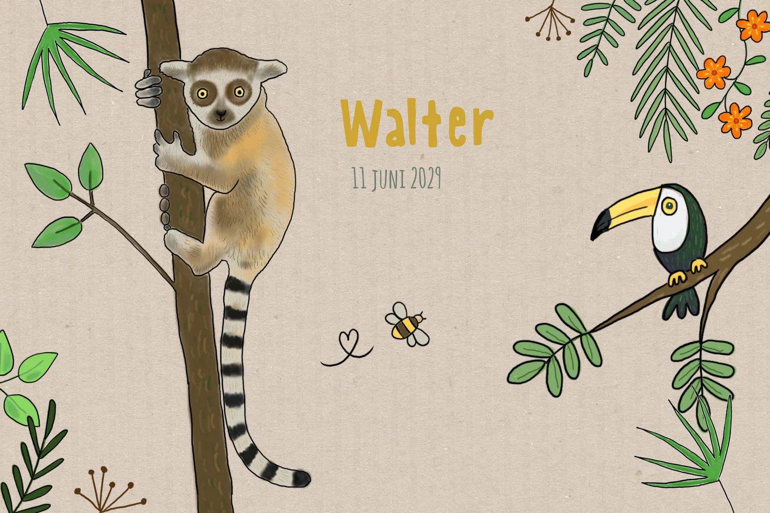 Een hip geboortekaartje voor een jongen in jungle-stijl met een maki, toekan, bij en veel planten op kraft. (3098)