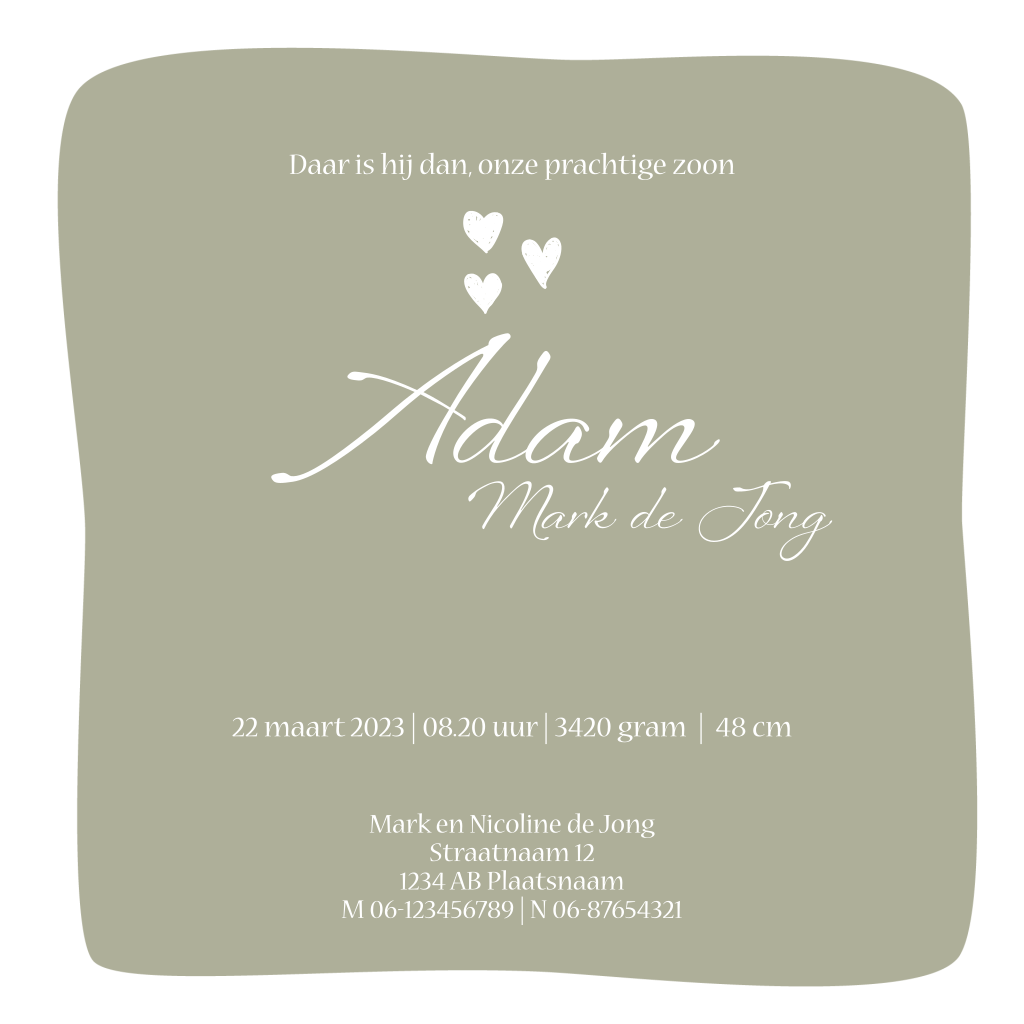 Geboortekaartje jongen kleur van het Jaar 2022 Olive Sprig van Histor verf. Olive Sprig is een flexibele grijsgroen die staat voor groei en de veerkracht van de natuur. Het is een ontspannende en verleidelijke kleur die een ruimte opfleurt en zorgt voor een organische levendigheid. (4218)