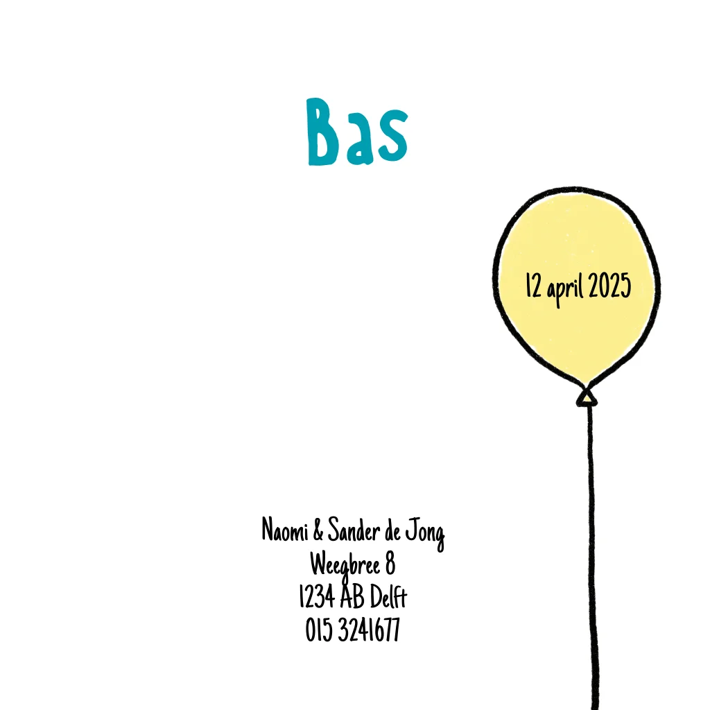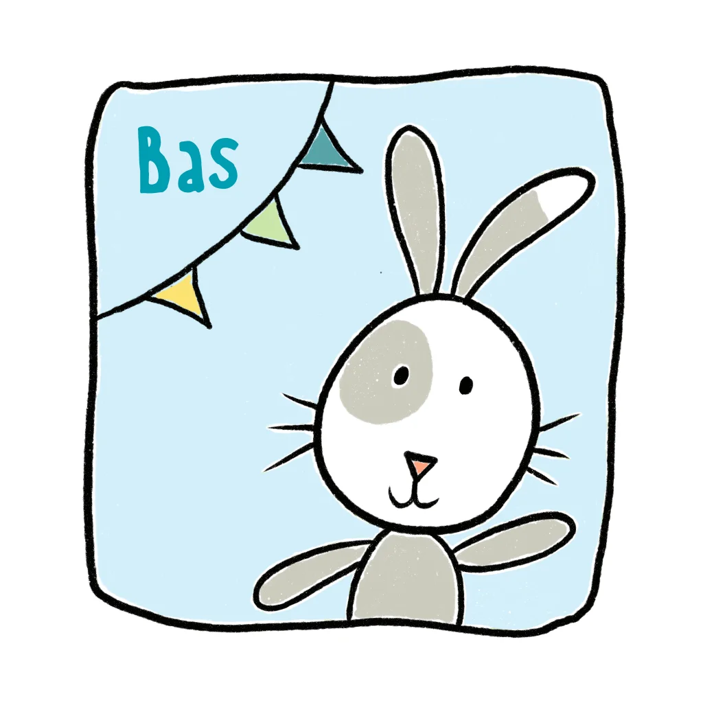 Een hip geboortekaartje in frisse kleuren voor een jongen met konijn en slinger. (183)