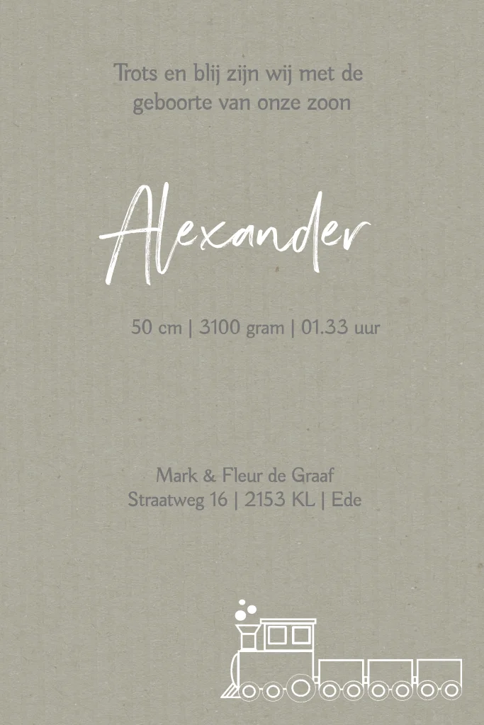 Modern geboortekaartje jongen met trein op kraft karton look achtergrond. (3723)