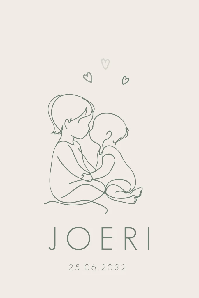 Een minimalistisch geboortekaartje met broertje en hartjes. Pas je ontwerp aan in onze editor.