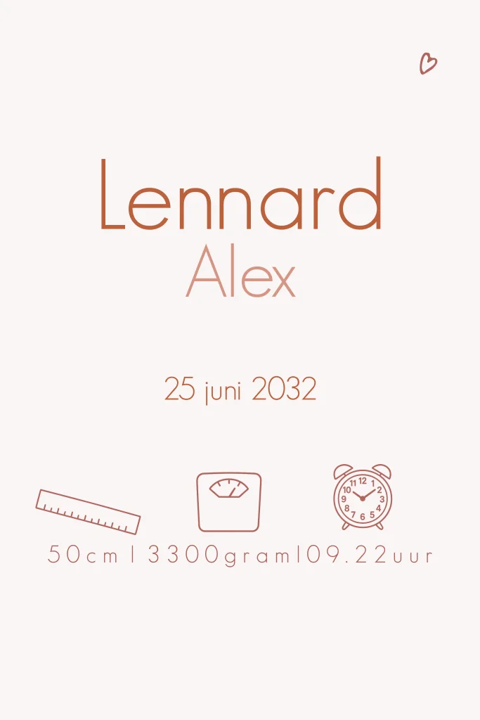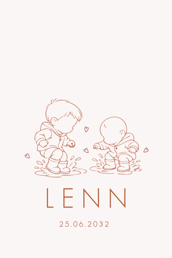 Een lief en stijlvol geboortekaartje voor een jongen met een lijntekening van broertjes met schattige laarsjes die samen in de plas springen. Dit kaartje heeft een warme, natuurlijke uitstraling die perfect past bij een herfst‑ of buiten‑thema. Pas het ontwerp eenvoudig aan in onze online editor.