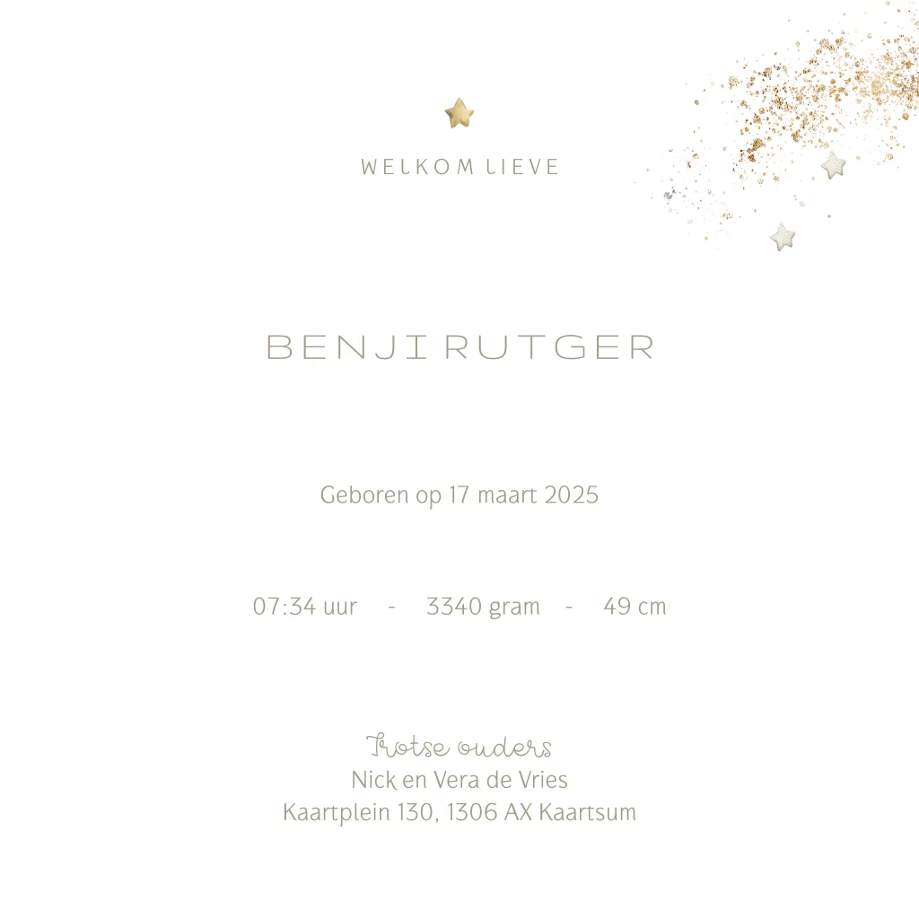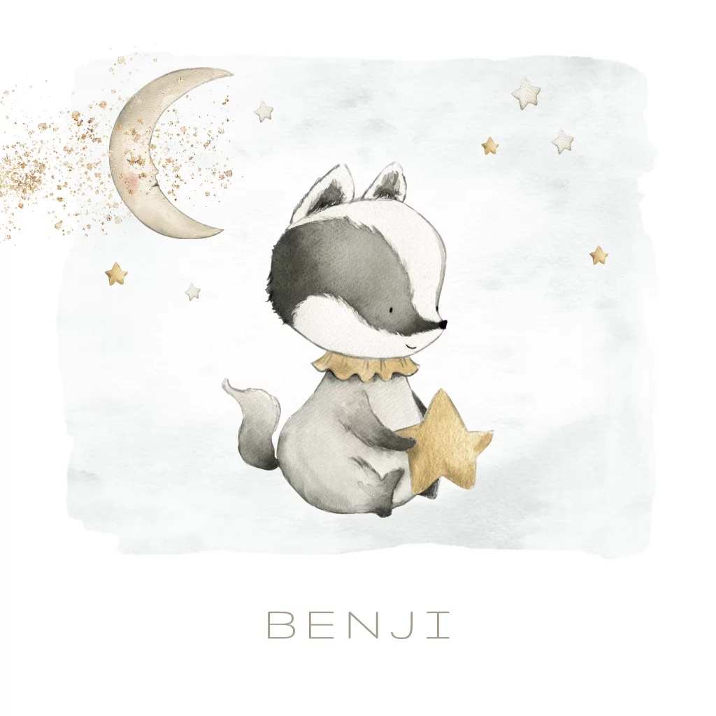 Lief geboortekaartje jongen in goudlook met stinkdier