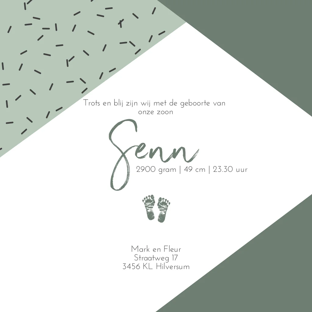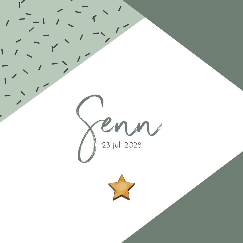 Geometrisch geboortekaartje jongen met confetti en echt houten sterretje. (3567) Geboortekaartjes jongen LET OP! Bij de proefdruk en eindbestelling wordt GEEN voorbeeld vormpje geleverd. Het houten vormpje op dit kaartje wordt niet mee gedrukt, deze is ter voorbeeld. Op die plek kun je straks zelf het Γ©chte houten vormpje plakken die je in het bestelproces bij dient te bestellen.