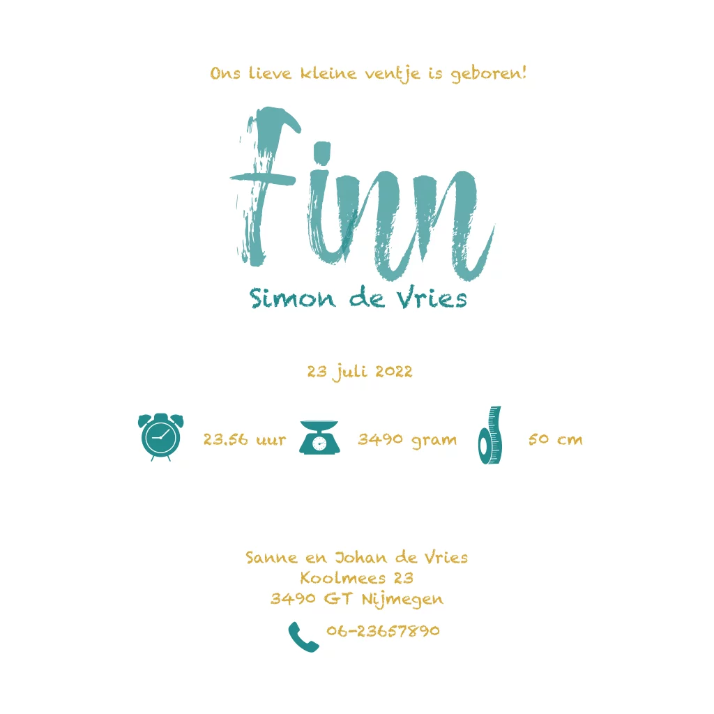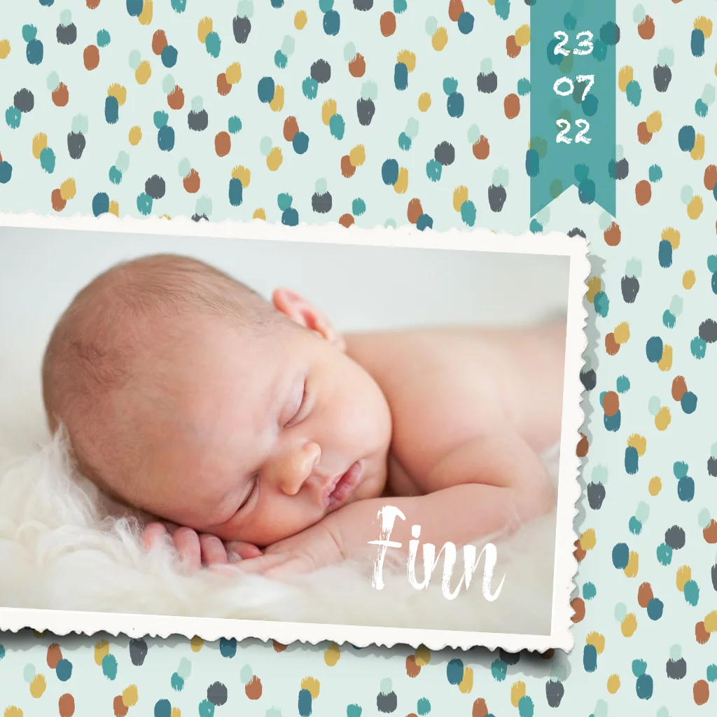 Geboortekaartje met verfstipjes in hippe kleuren. De foto kun je vervangen met jouw eigen foto van de baby. (203)