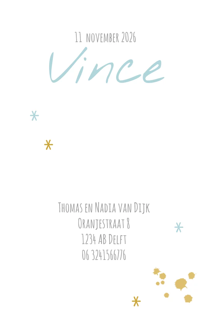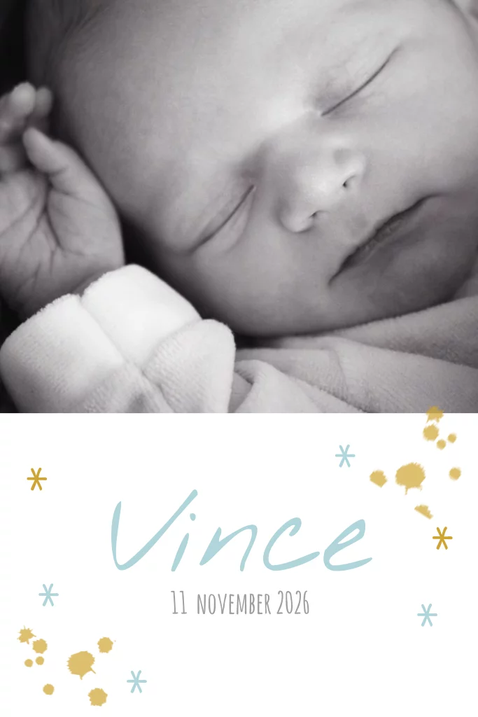 Een persoonlijk geboortekaartje voor een jongen met spetters, sterren en ruimte voor een eigen foto. (3288)