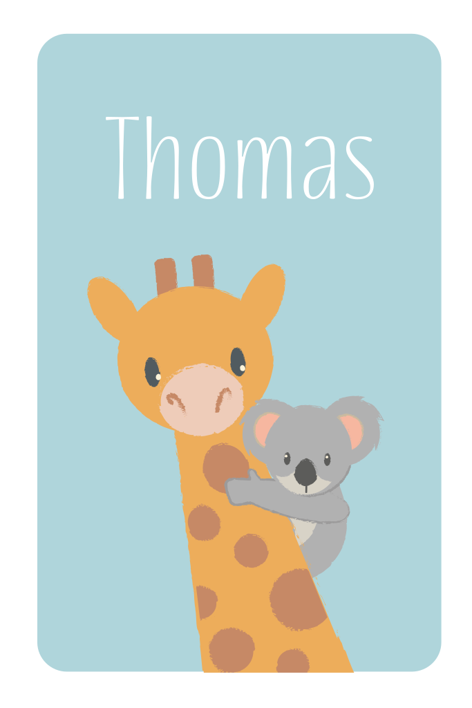 Een getekend geboortekaartje met een giraffe en een koalabeer. (4557)