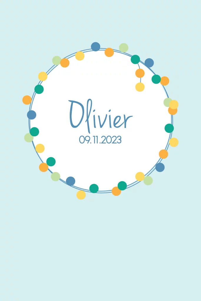 Lief geboortekaartje voor een jongen met een krans van bolletjes op een licht blauwe achtergrond. (3619)
