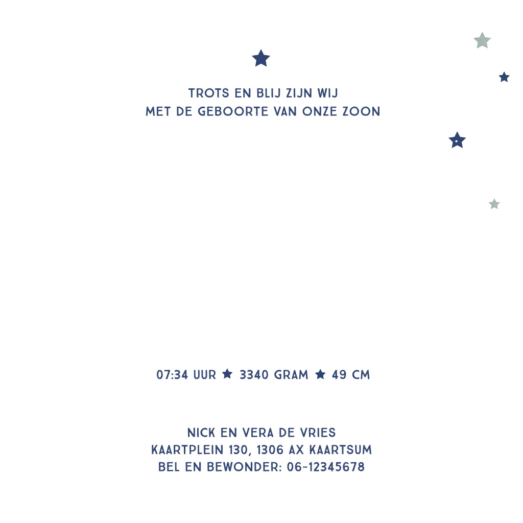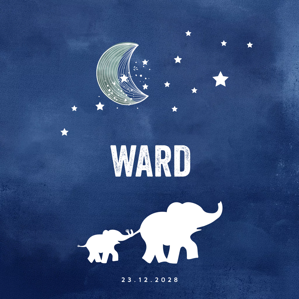 Jongens geboorte kaartje met blauwe achtergrond, olifantjes en maan in foliedruk.