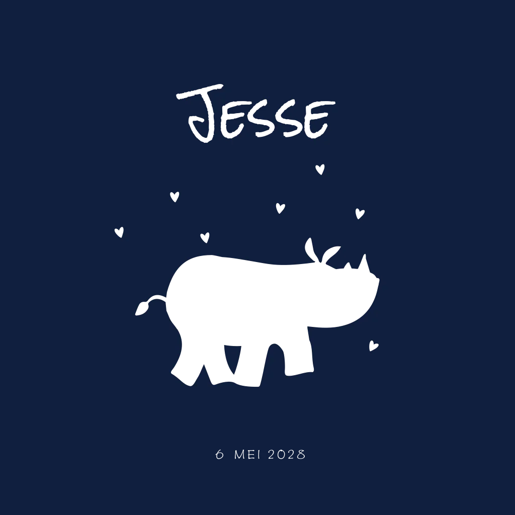 Stoer geboortekaartje jongen donkerblauw met neushoorn en hartjes in foliedruk. (4230)
