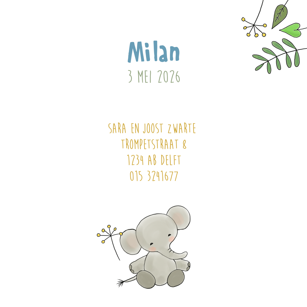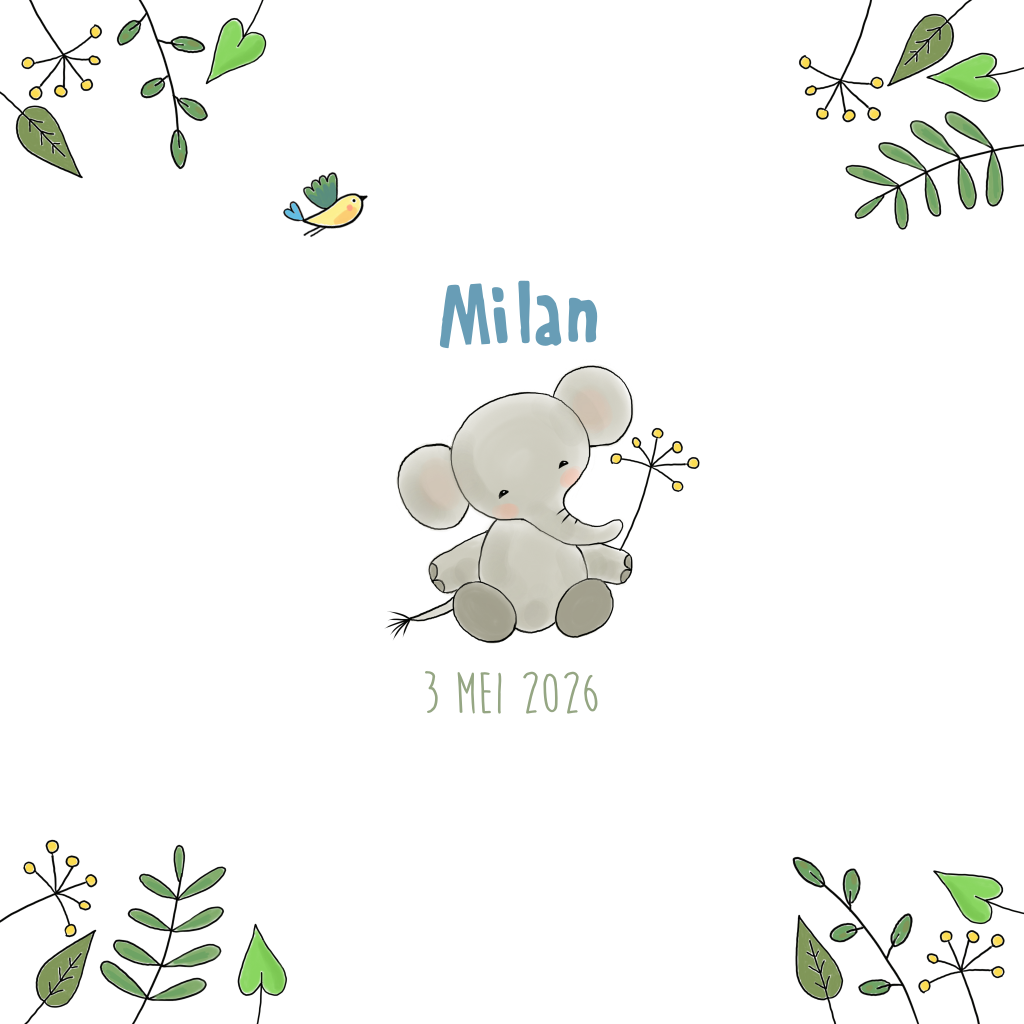Een vrolijk, getekend geboortekaartje voor een jongen met olifant vogel en takjes. De achtergrondkleur is naar wens aan te passen. (278)