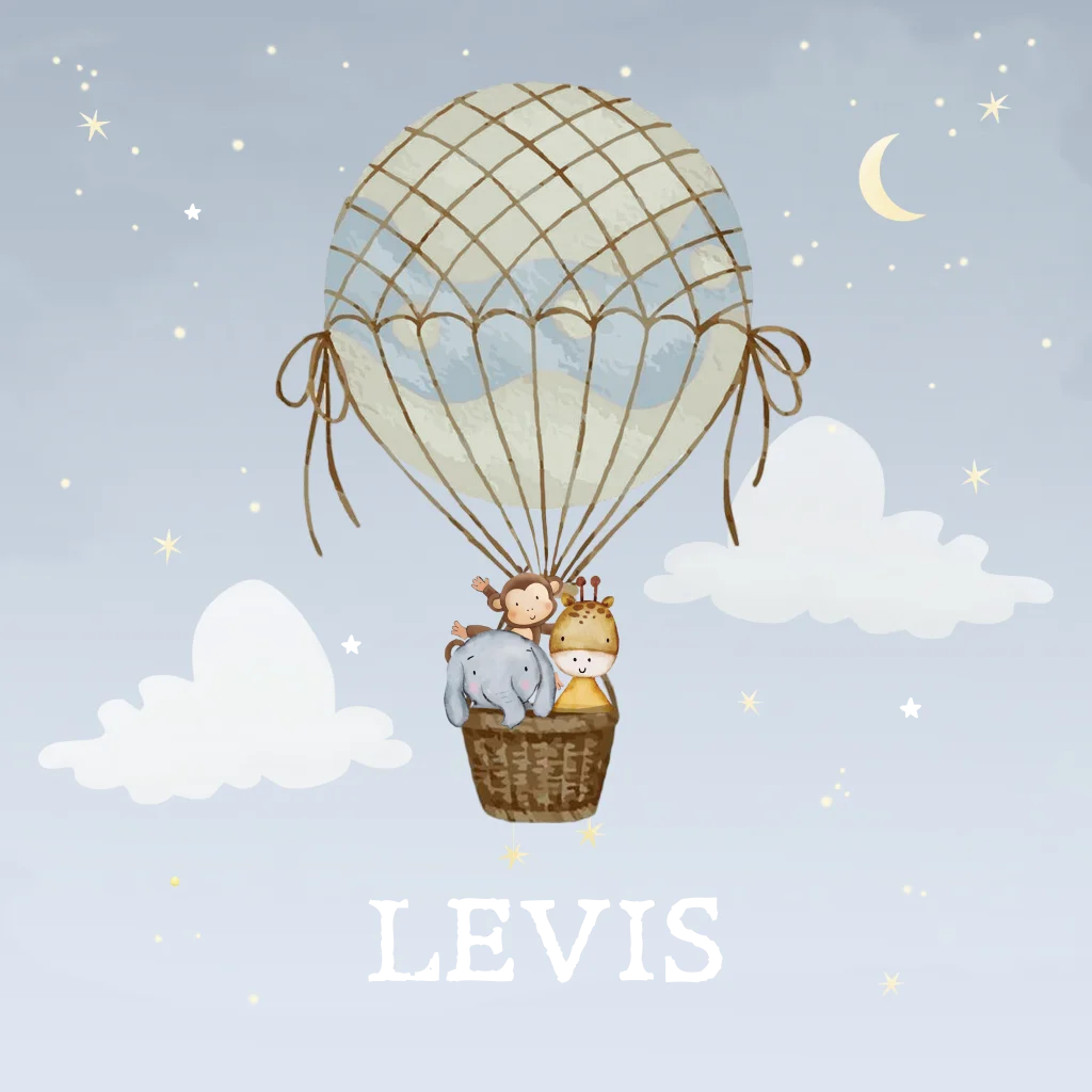 Een lief en dromerig geboortekaartje voor een jongen met een olifantje, giraf en aapje samen in een luchtballon. De zachte kleuren en lichte uitstraling geven het kaartje een warme en rustige sfeer. Pas het ontwerp eenvoudig aan naar eigen wens in onze online editor.