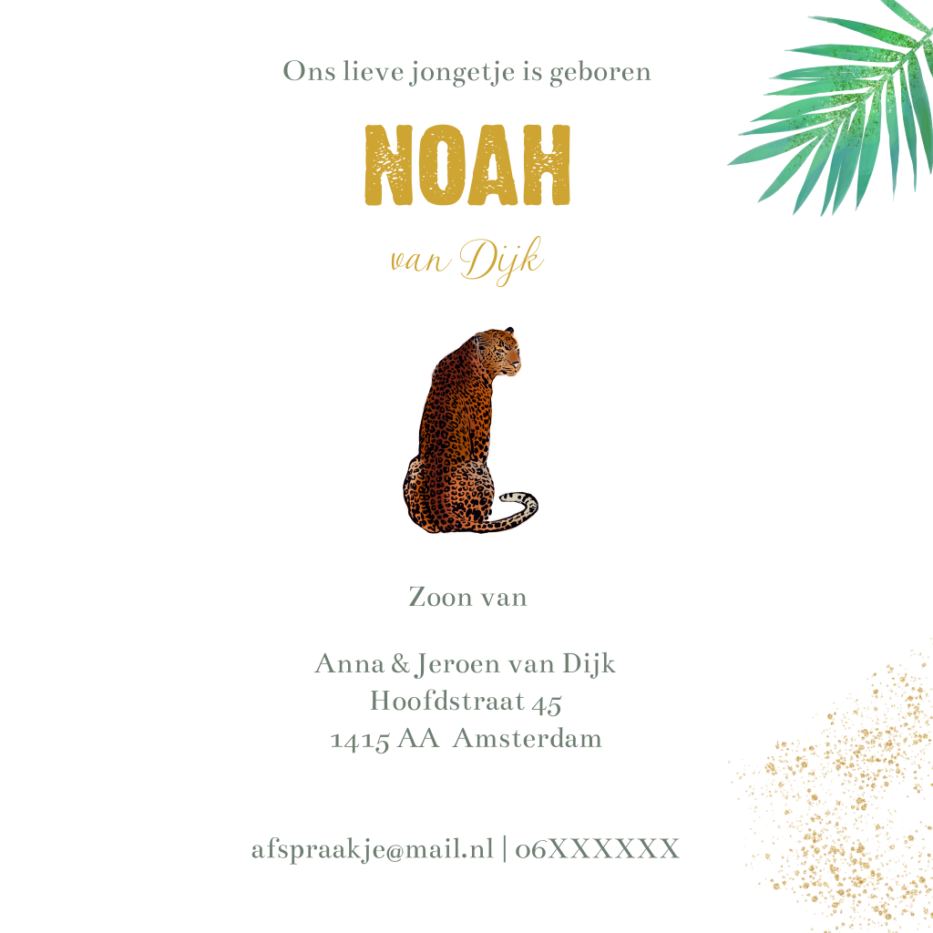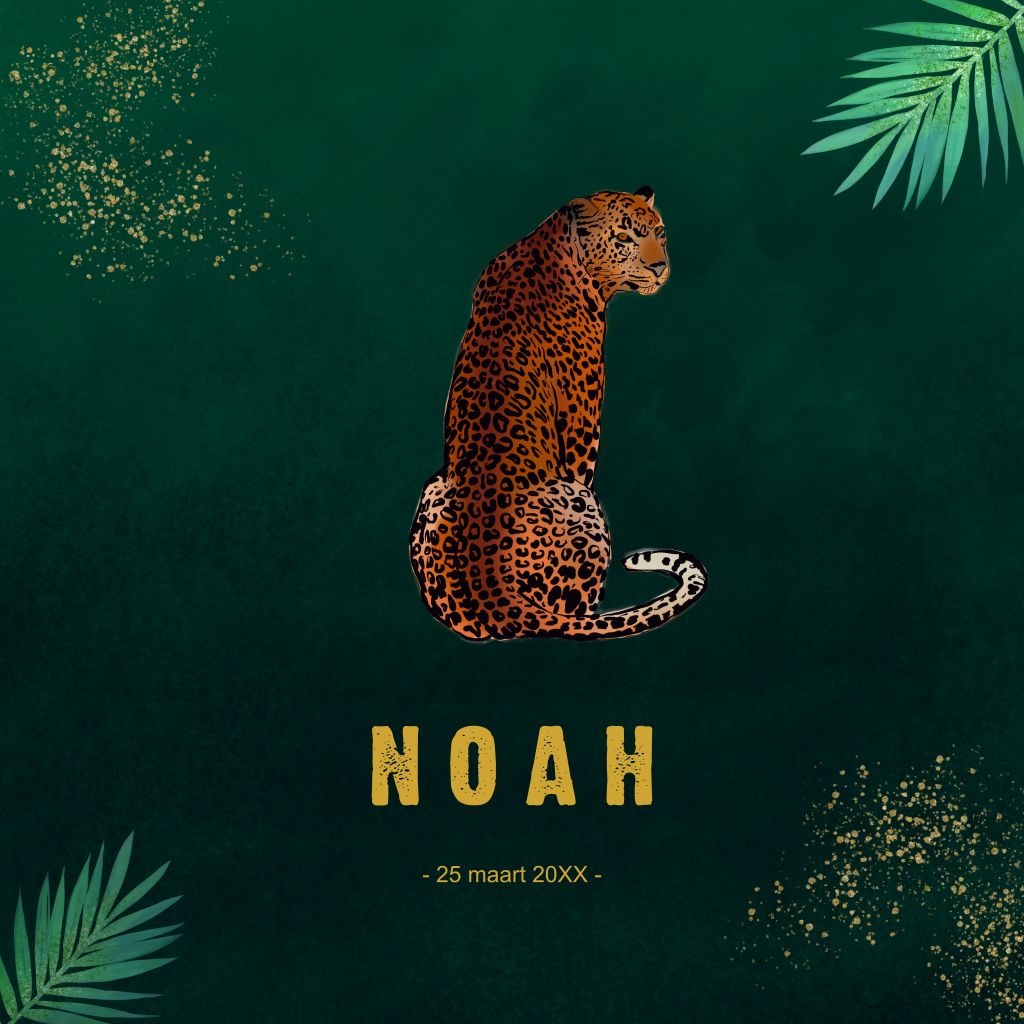 Geboortekaartje voor een jongen met mooie panter en tropische achtergrond in het groen donkergroen met jungle bladeren (3417)