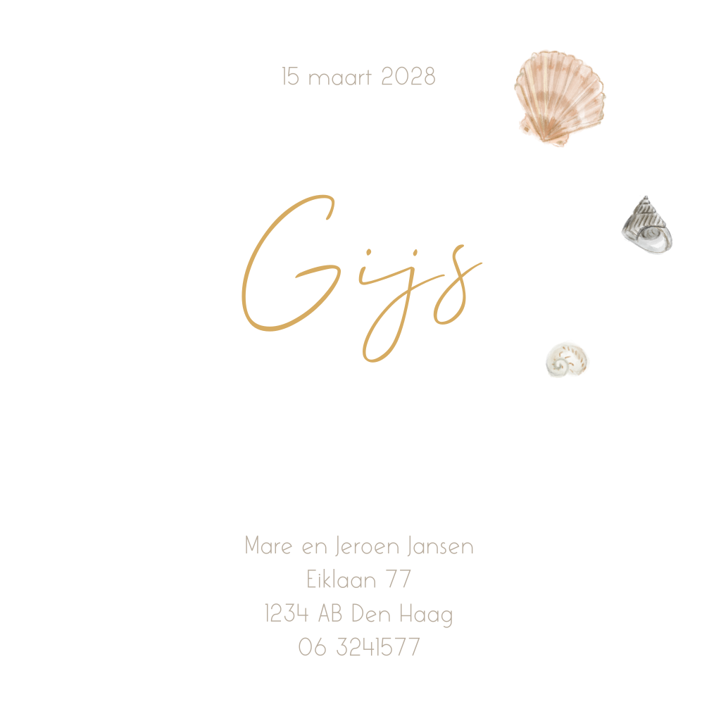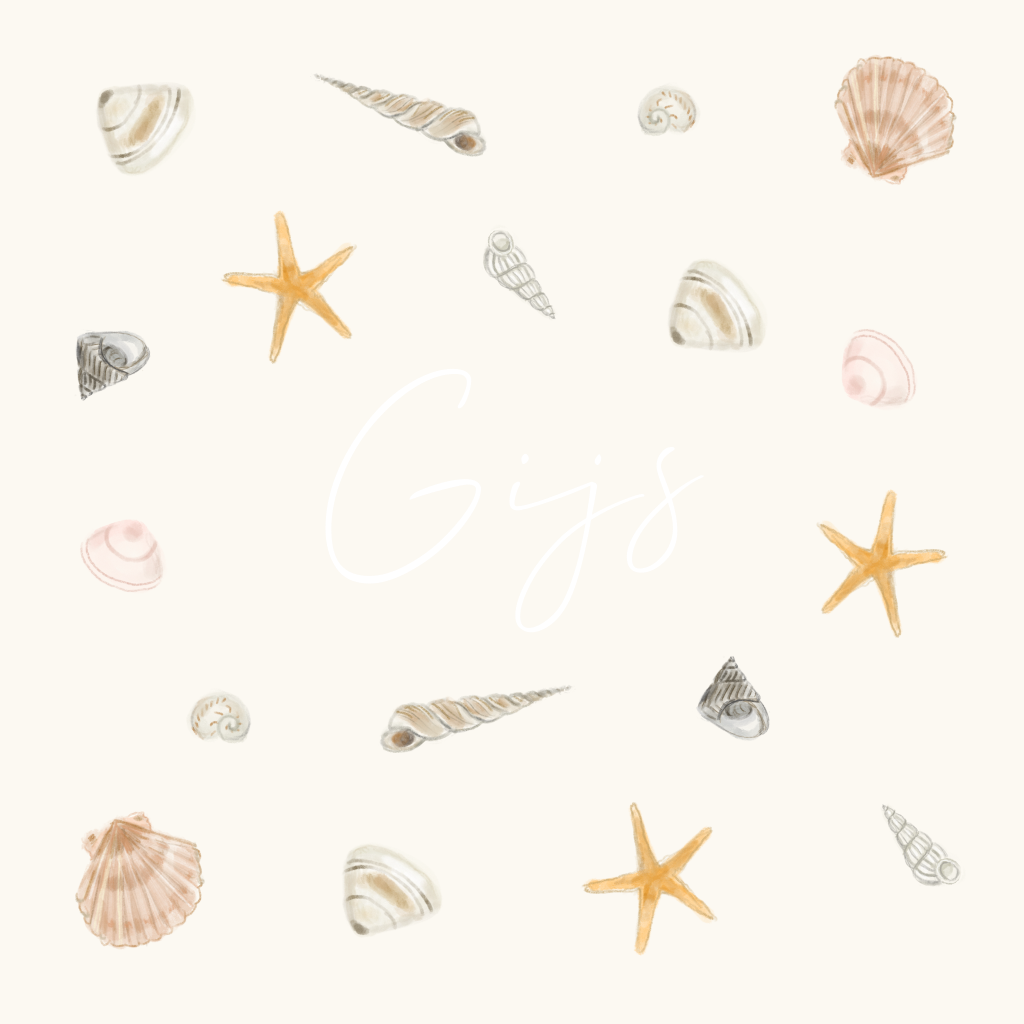 Een origineel en verfijnd geboortekaartje voor een jongen met schelpen op een zandkleurige achtergrond. (4642)