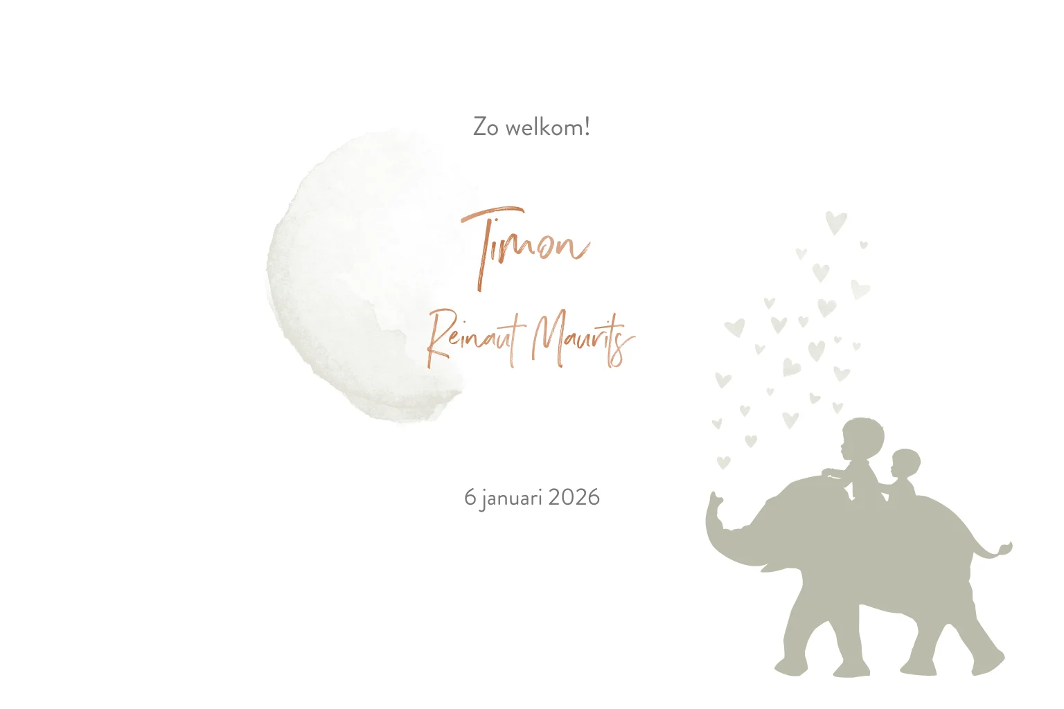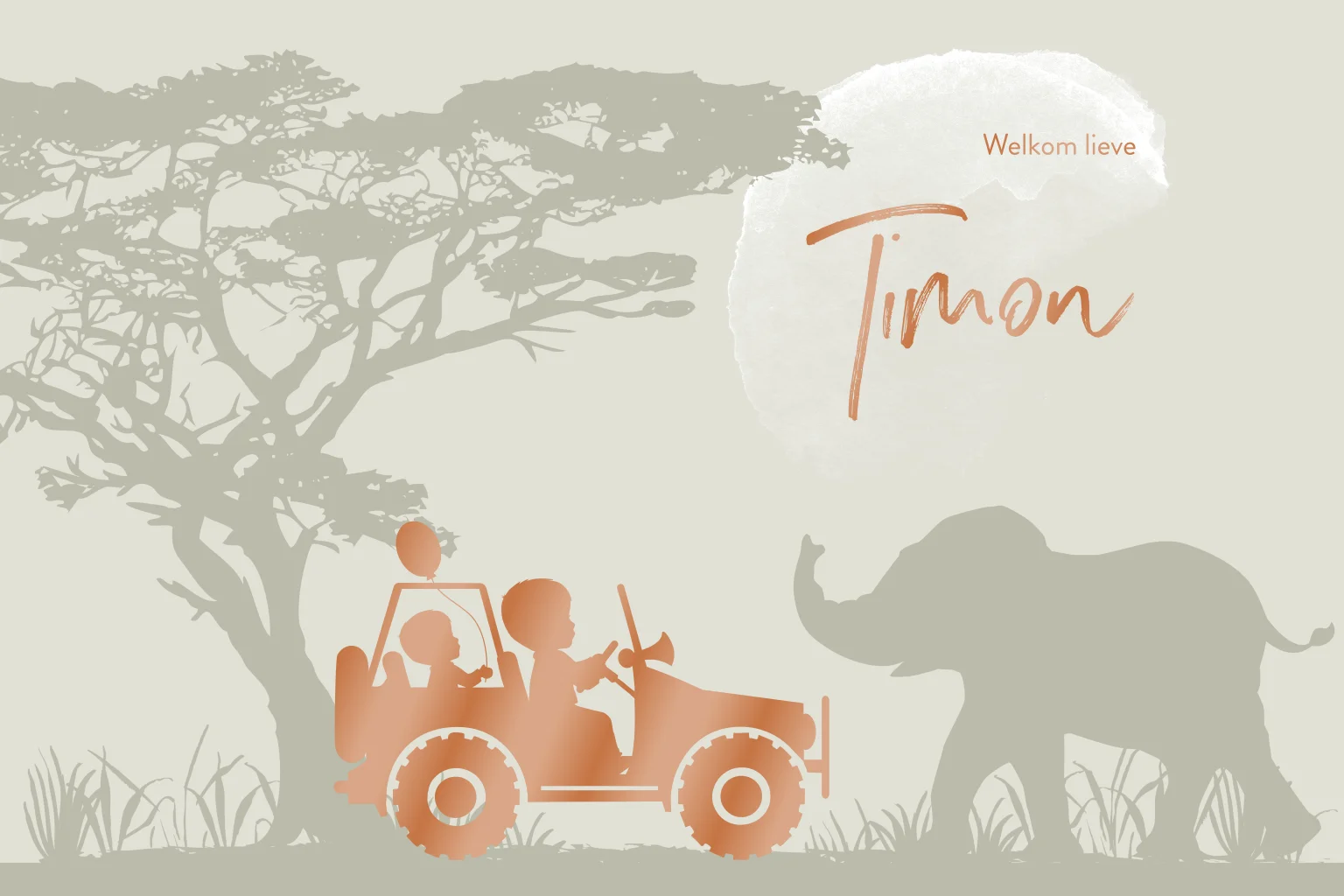 Een avontuurlijk geboortekaartje voor een tweede kindje met een truck en een silhouet van twee jongetjes op safari, gedrukt met hoogglans. Pas het ontwerp eenvoudig aan naar eigen wens in onze online editor.