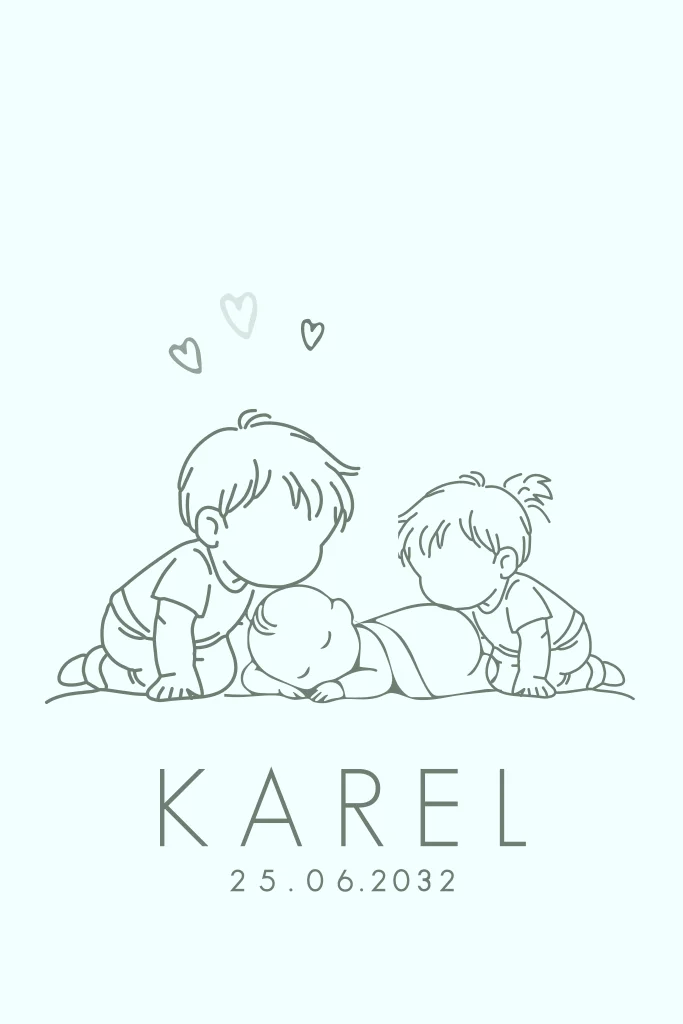Een warm geboortekaartje voor een jongetje met een lijntekening van een slapende baby omringd door zijn grote broer en zus. Het kaartje heeft een tedere uitstraling en benadrukt de verbondenheid tussen de kinderen. Pas het ontwerp eenvoudig aan naar eigen wens in onze online editor.