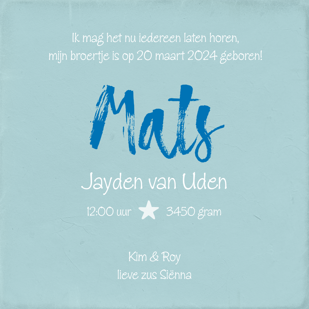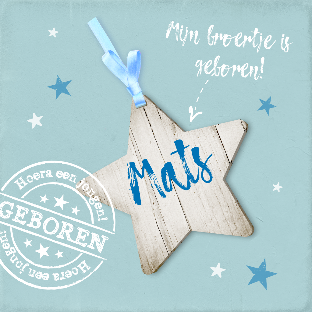 Een broertje! Wat is het leuk om een een leuke foto van je baby en zijn broer of zus aan de binnenkant te plaatsen. Op de ster schrijf je de naam van je jongen en in de stempel kan je de geboortedatum zetten.