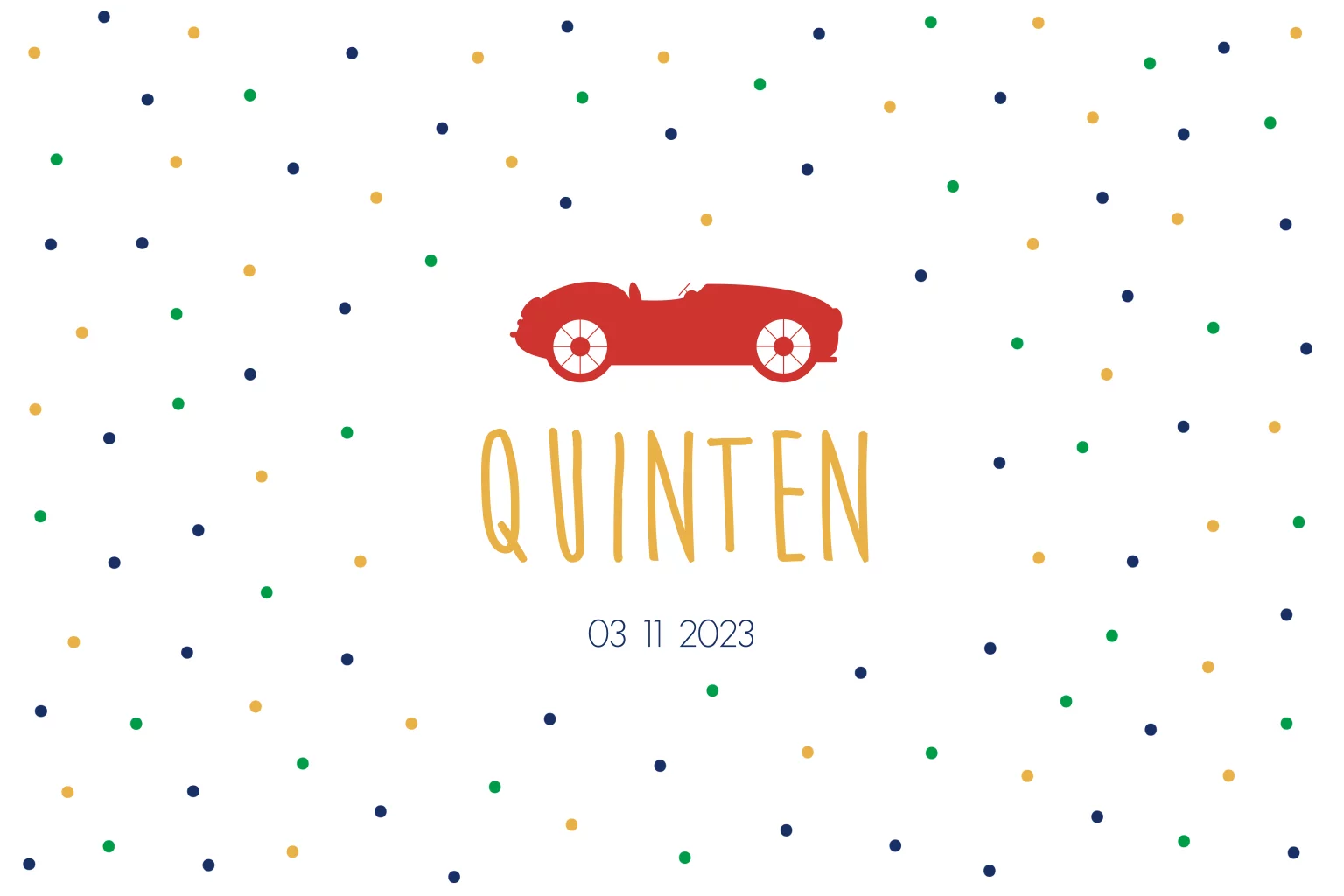 Geboortekaartje voor een jongen met stippen en een grafische auto. (3754)