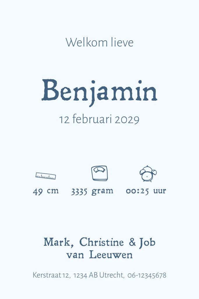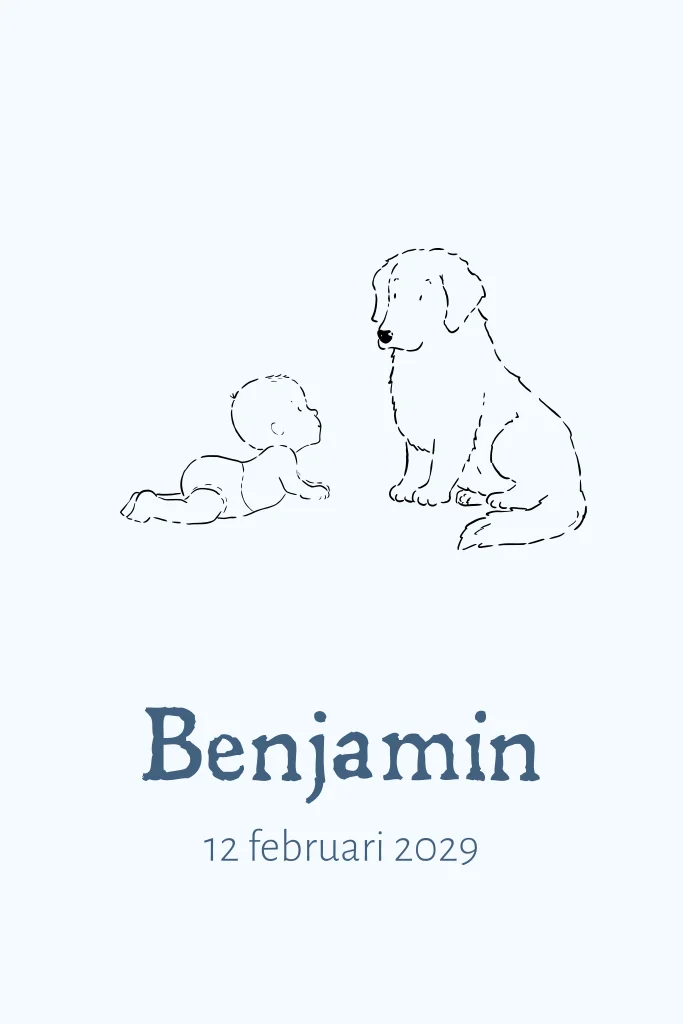 Een lief geboortekaartje voor een jongen met een subtiele lijntekening van een kruipende baby naast een vrolijke golden retriever. Pas het ontwerp eenvoudig aan naar eigen wens in onze online editor. Uit de speciale huisdieren collectie 'Thuis is met jou 🐾.