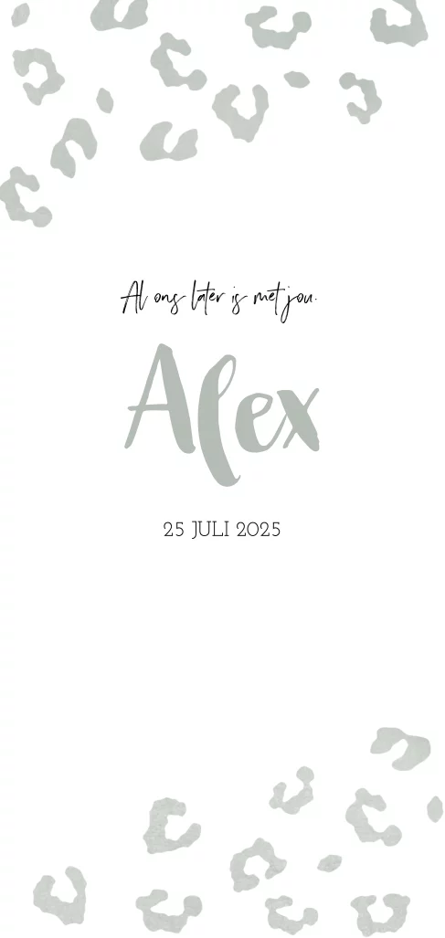 Hip geboortekaartje voor een jongen met trendy luipaardpatroon in pastelgroen. (233)