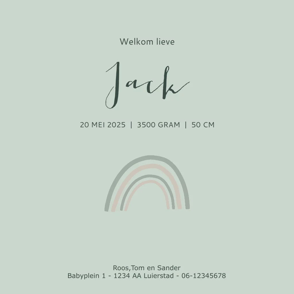 Jongens geboortekaartje met regenboog in trendy groen en beige. (3729)