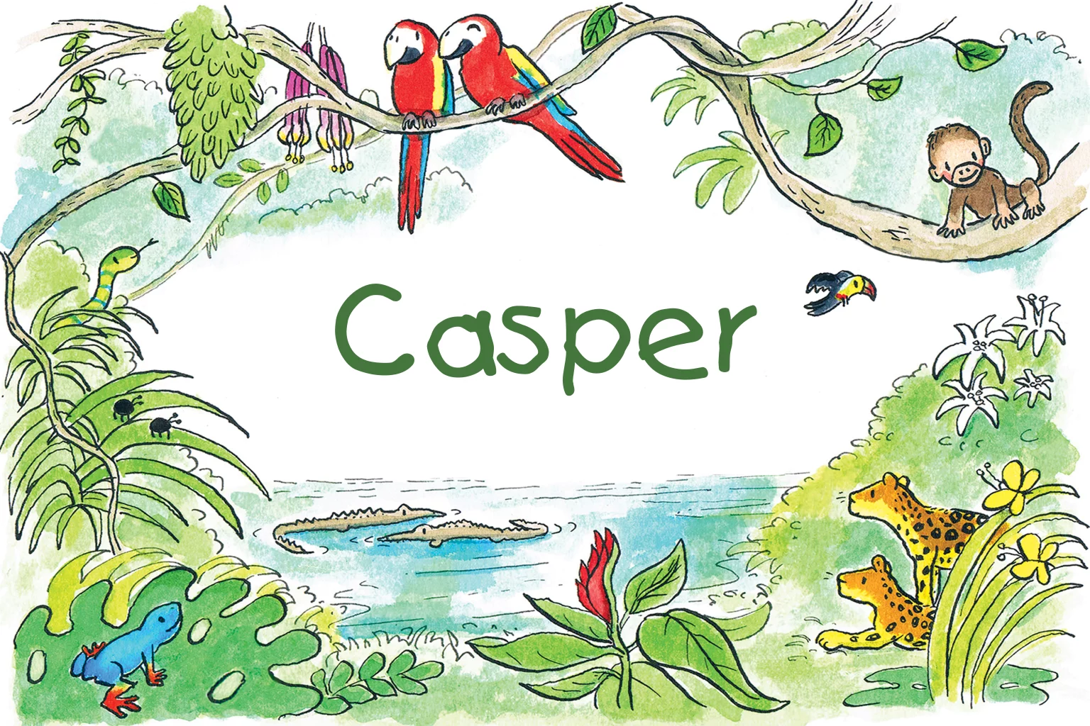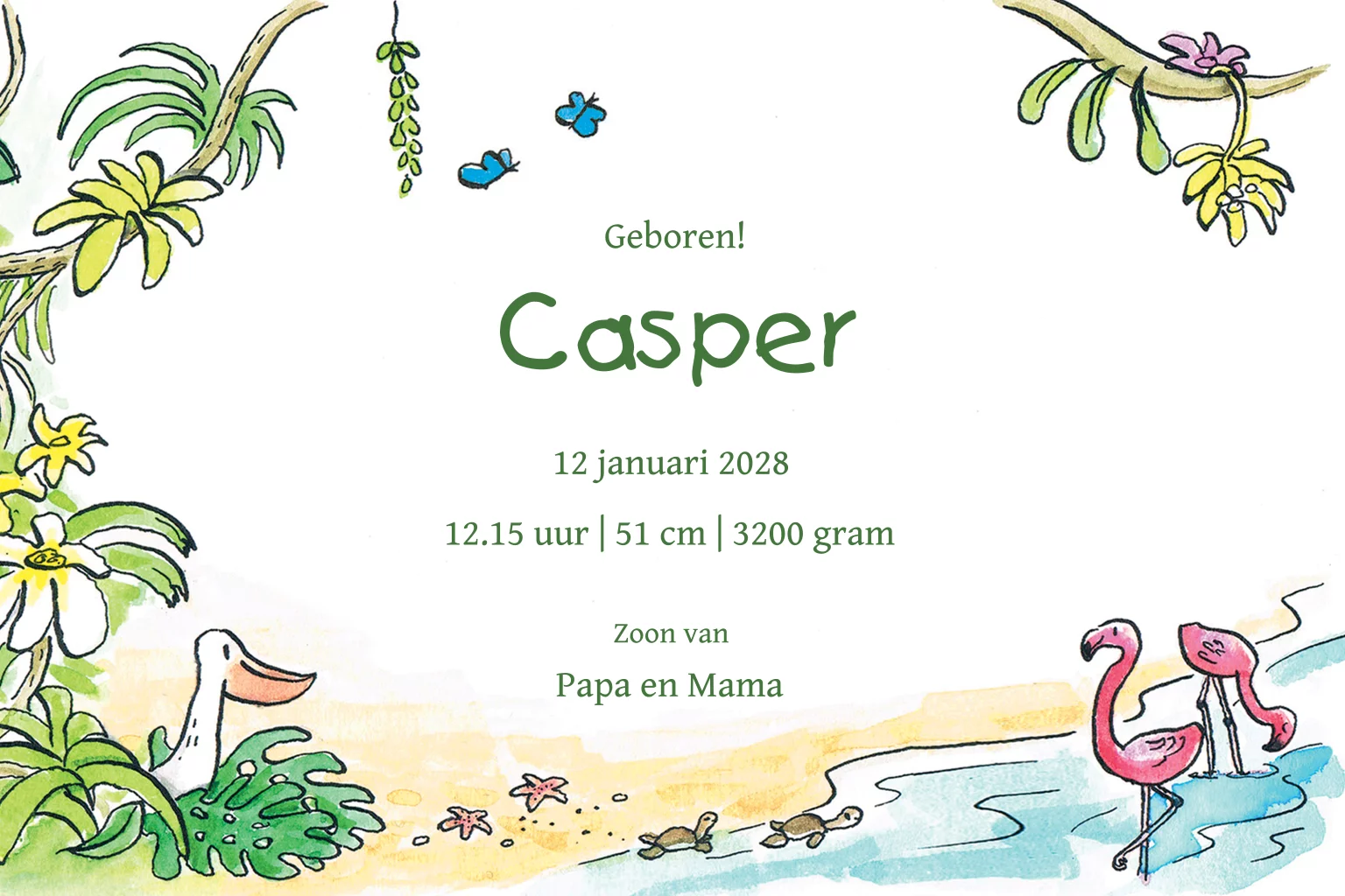 Getekend geboortekaartje voor jongen. Tropisch oerwoud met dieren, bloemen en strand. Avontuurlijke ontdekkingsreis in natuur met flamingo's in zee. (3626)