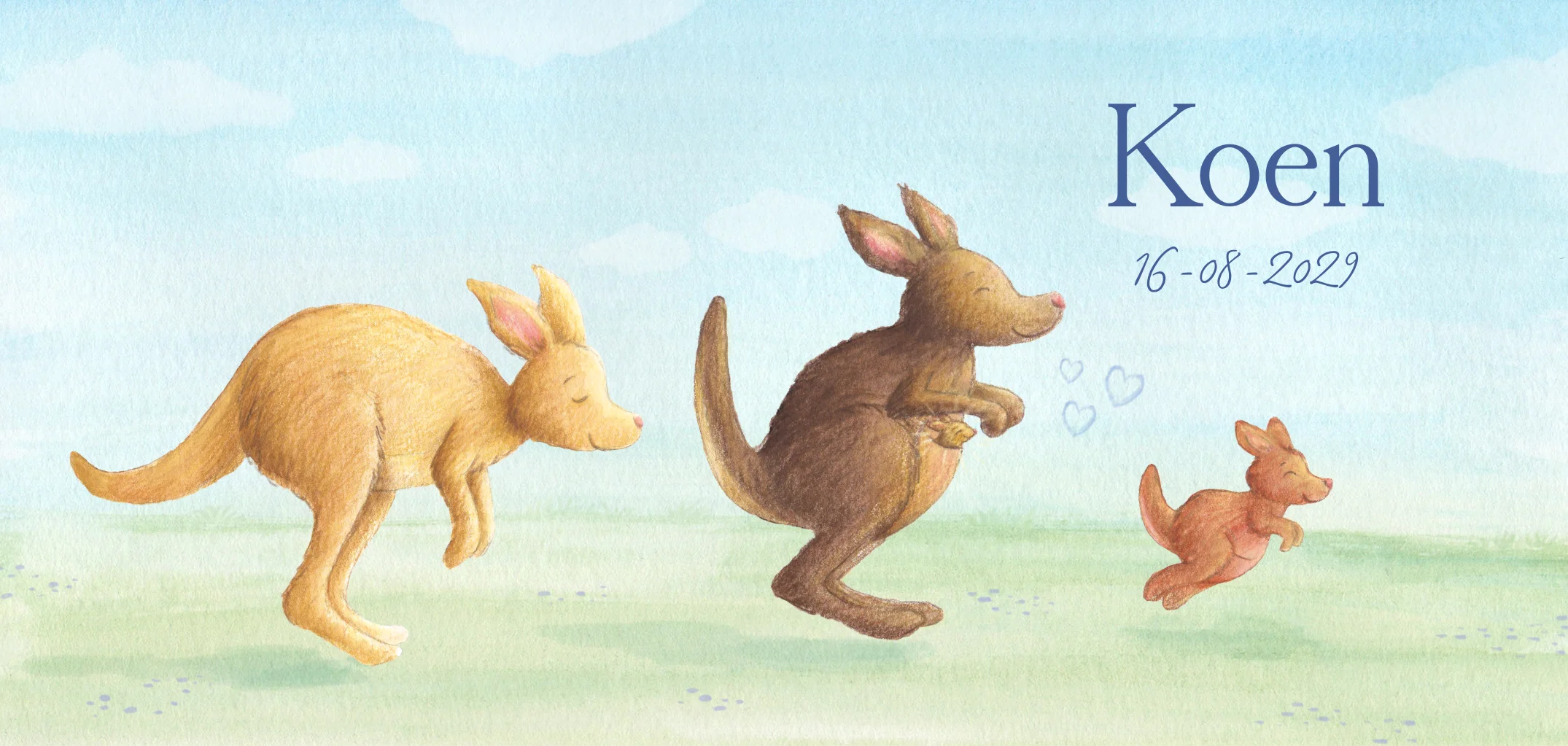 Een vrolijk geboortekaartje voor het tweede kindje, een jongen. Met een lieve kangoeroe‑familie in de natuur. De illustratie van de kangoeroe papa, mama en met haar andere kleintje straalt een warme en speelse sfeer uit. Pas het ontwerp eenvoudig aan naar eigen wens in onze online editor.
