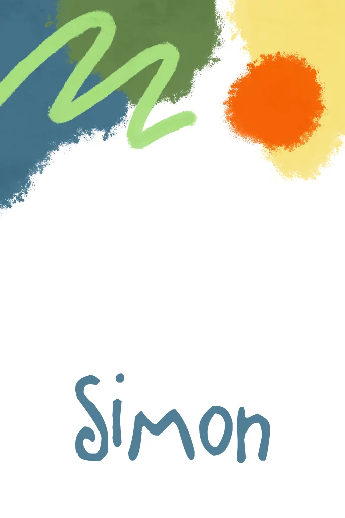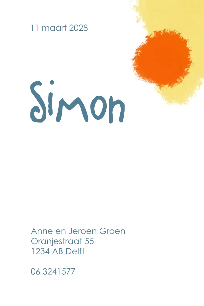 Een origineel geboortekaartje voor een jongen met gekleurde verf vlakken in blauw groen geel en oranje. (4645)